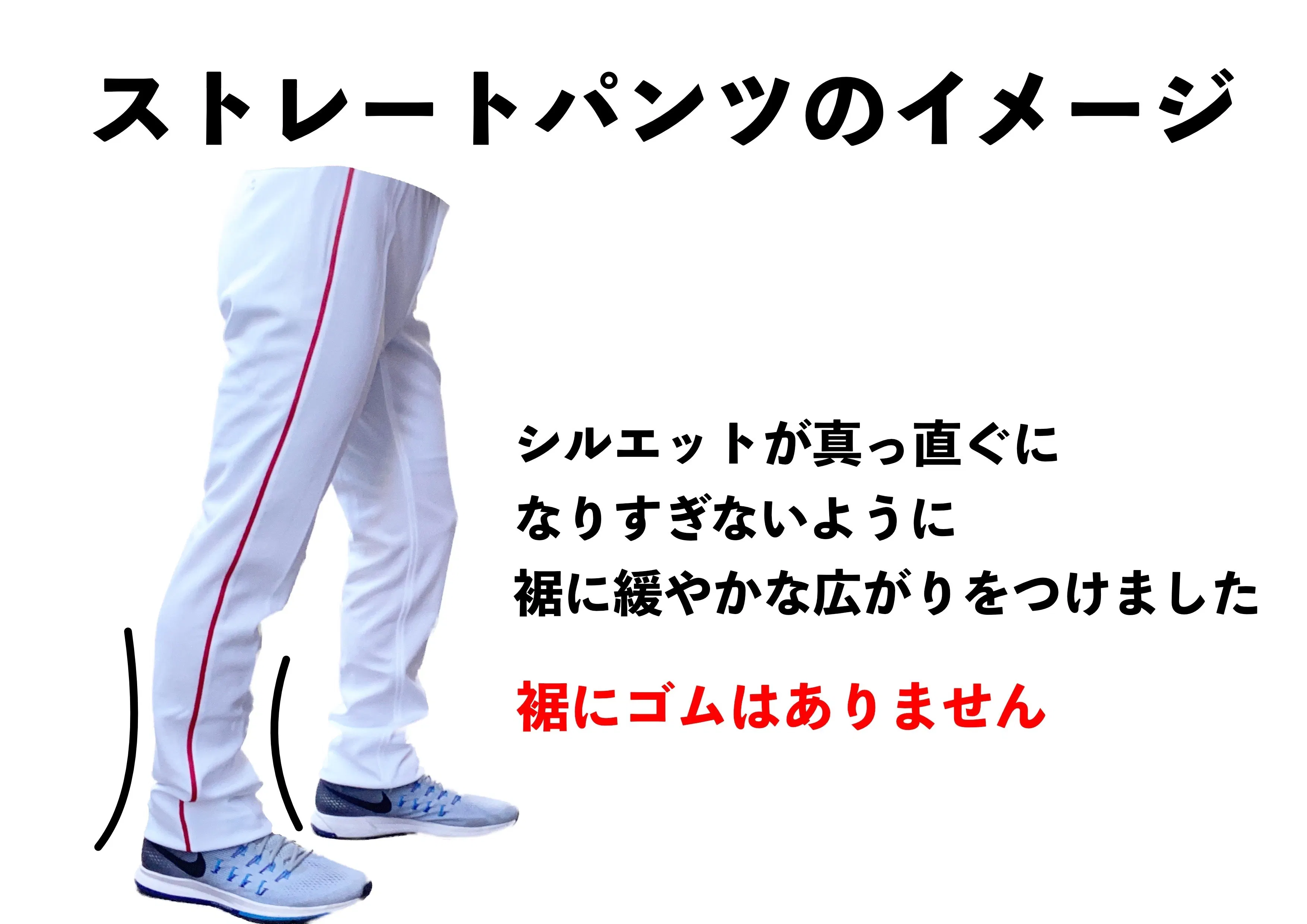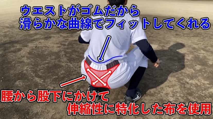 ①ベルト不要!他のスポーツのユニフォームを参考にした、スエットやジャージのようなウエストがゴムのパンツ。