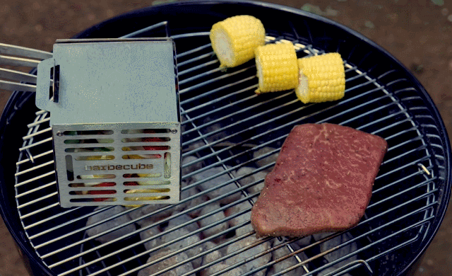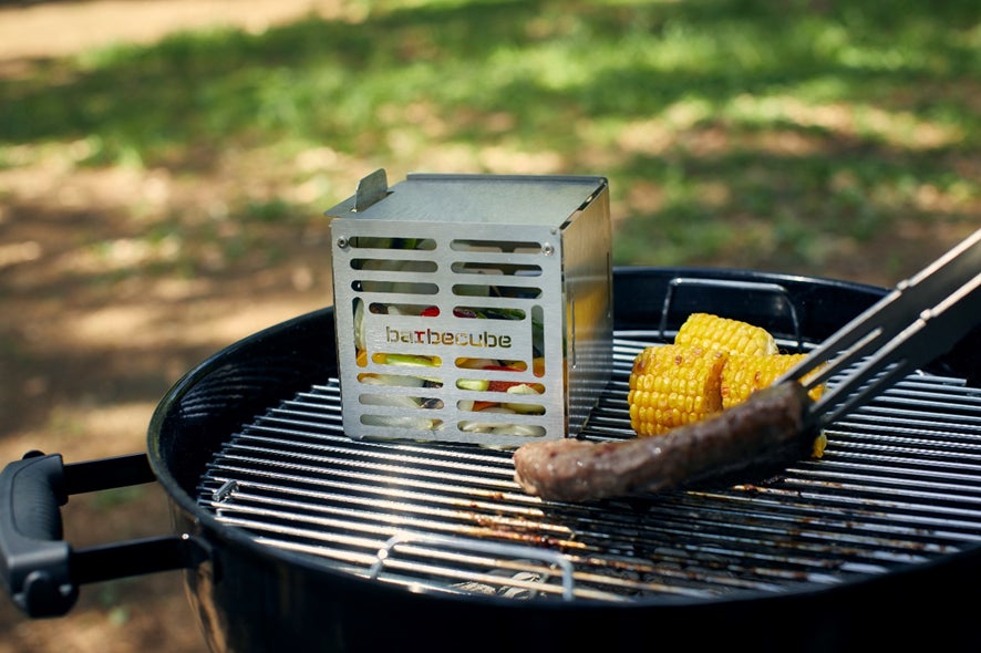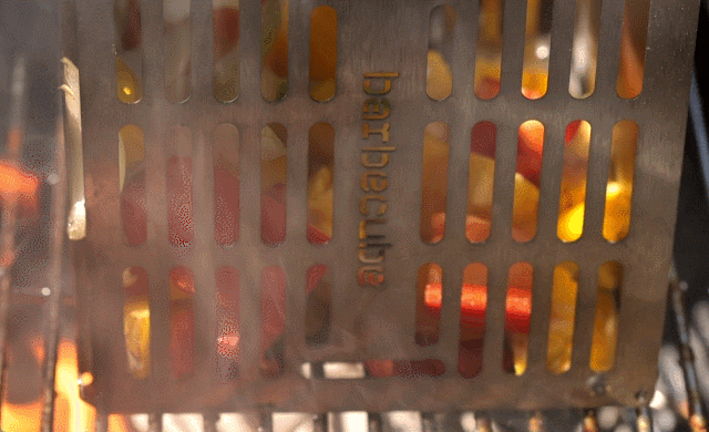 【Barbecube】は適度に細かく切った野菜やフルーツをキューブに入れて蓋をし、金網や鉄板の上に置いて火にかけた後は、