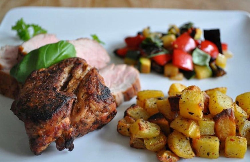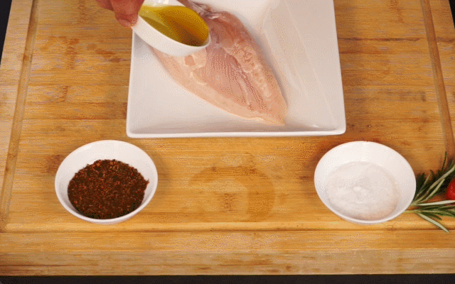 ①食材を適当な大きさにカットし、下味をつけ、オリーブオイルなどで合えます。