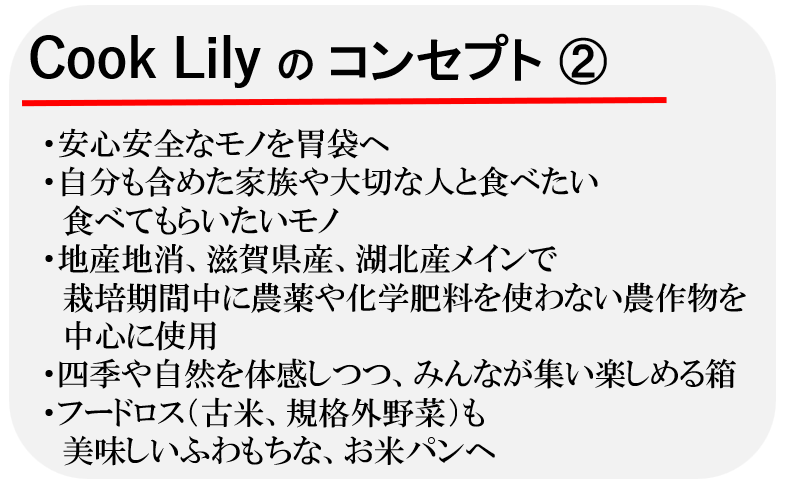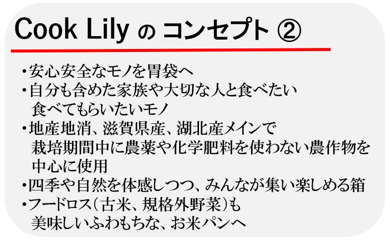 安心安全なものを自分も含めた家族や大切な人と食べたい、食べてもらいたい。滋賀県産、湖北産で農薬を使わず頑張っていらっしゃる農家さんの野菜を使いたい。古米や規格外野菜など(フードロス)も美味しいふわもちなお米パンを作りたい。