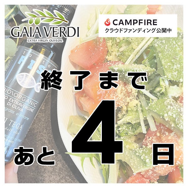 クラウドファンディング最終日を迎えました!たくさんのご支援ありがとうございます。クラウドファンディングは初めての挑戦で、最初は不安もありましたが、皆さまのおかげで目標金額も達成することができました。本当に美味しい、高品質のこだわりのオリーブオイルをたくさんの方に知っていただきたいという思いをこのチャレンジで少しでも多くの方に伝えられたのが、本当に嬉しいです!すでにリターンを受け取っていただいた方、いかがでしたでしょうか?獲れたてオリーブオイルや定期便を予約していただいている方、これからお届けしていきますので、楽しみにお待ちください!このたびは私たちのチャレンジに賛同していただき、本当にありがとうございました!今後もGAIA VERDIは皆さまに100%イタリア産のオリーブオイルをお届けしていきます。どうぞよろしくお願い致します!