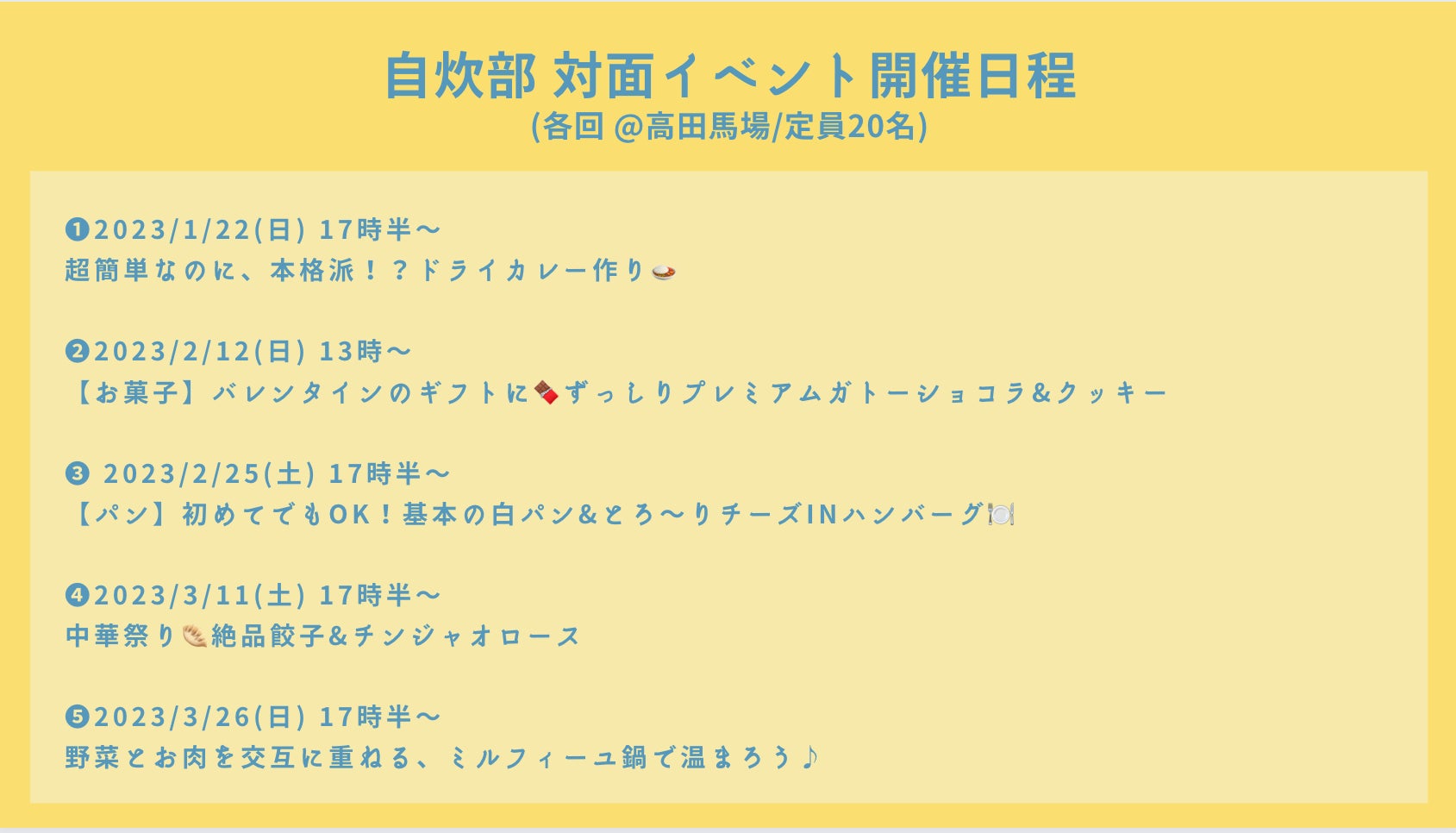 2023年1月〜、大学3・4年生向けに、全5回の自炊イベントを開催。