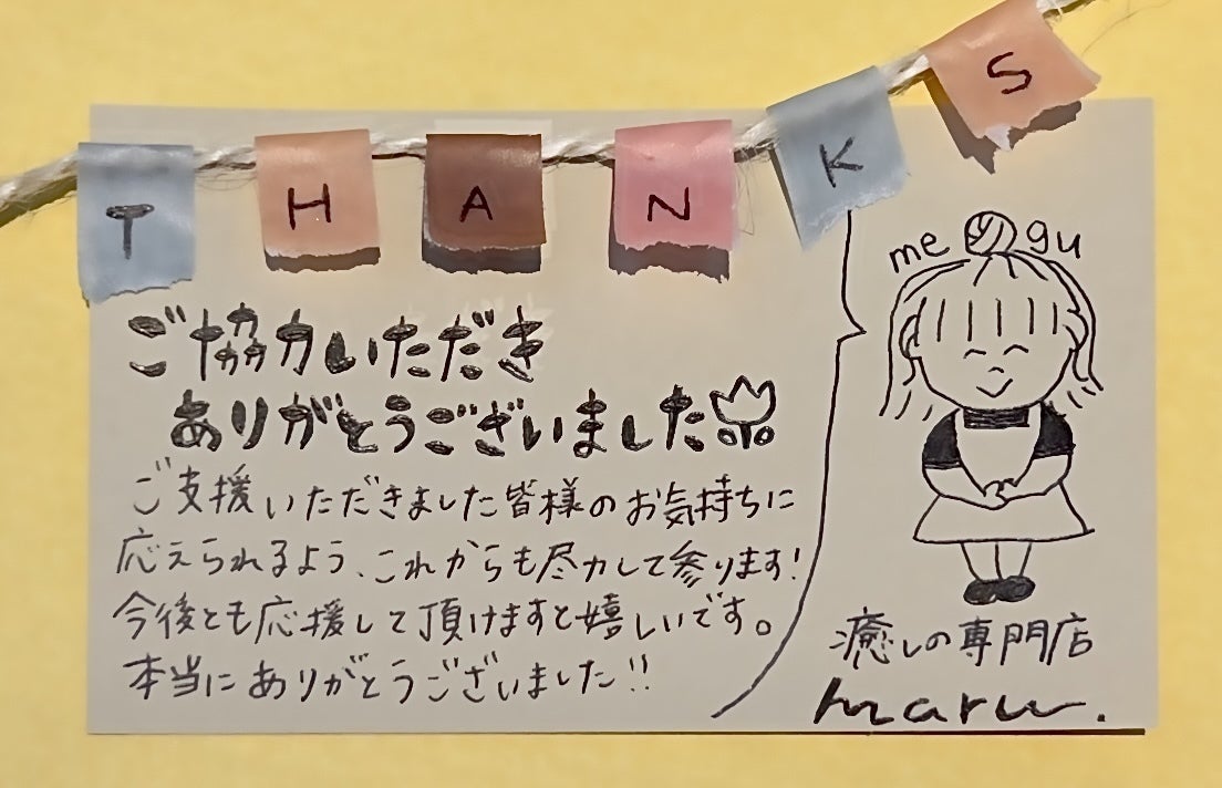 2023/05/09 21:54この度は3/25に開始いたしましたプロジェクト、「ハーブテントとアロマリンパトリートメントで癒しのサロン開業の夢を叶えたい!!」へのご支援、本当にありがとうございました。皆様からの温かいご支援によって、1週間で目標金額の30万円を達成し、なんと最終的に59名の方から合計565,500円のご支援をいただくことができました!ご協力頂きましたこと、心より感謝申し上げます。本日5/9、お気持ち支援の方・施術チケットのリターンを、ご選択頂いた方に、メールをお送りしました!【iyashino.maru@gmail.com】よりお送りしておりますので、ご確認をお願いいたします。迷惑メールフォルダなどに振り分けられる場合がございますので、受信フォルダ以外もご確認いただけると幸いです。精油ギフトをご選択の方は今月下旬に発送を予定しておりますので、暫くお待ちください。改めまして、ご支援いただき誠にありがごうございました! もっと見る