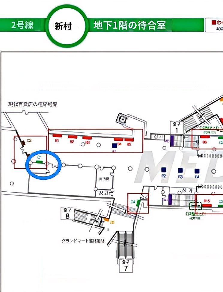 地下鉄新村駅7番8番出口近く、現代百貨店の連絡通路途中にあります青丸のC1の位置となります。