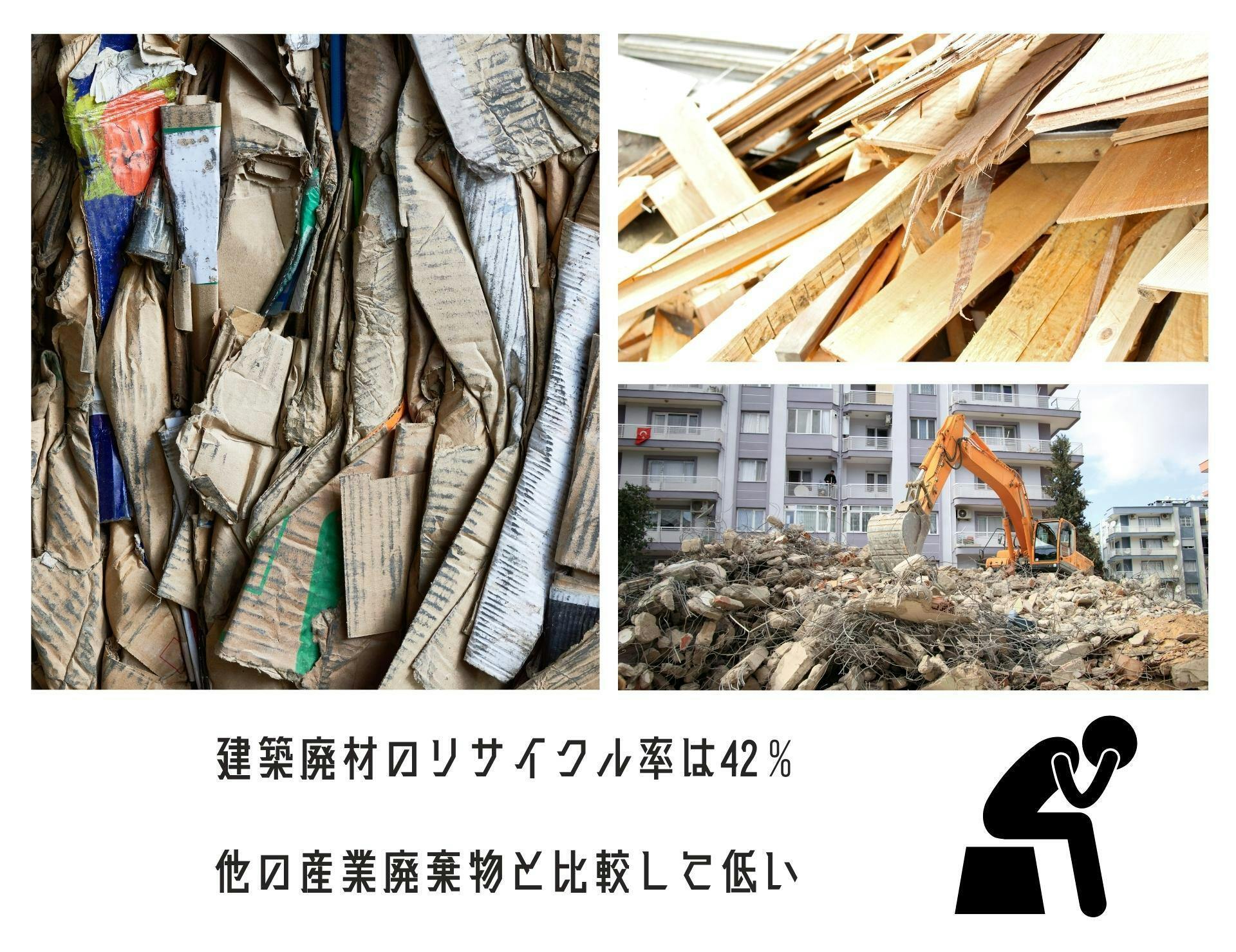 さらに建設省の調査²によると、建築廃材(解体後の使用済み建材、建築時に出た端材、未使用建材などの総称)のリサイクル率は42%と低く、建築廃材を十分に有効活用できているとは言えない状況です。