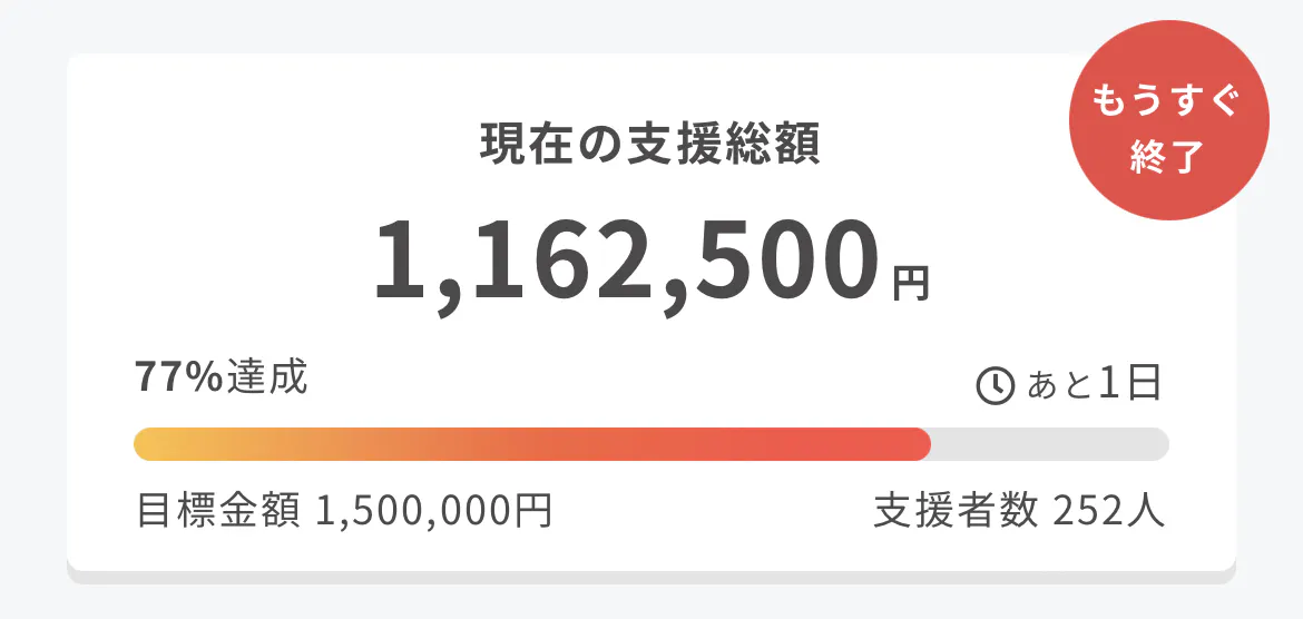 本プロジェクトも終了まであと1日、時間にして34時間を切りました。現時点で達成率77%、支援総額は116万円を超えました。