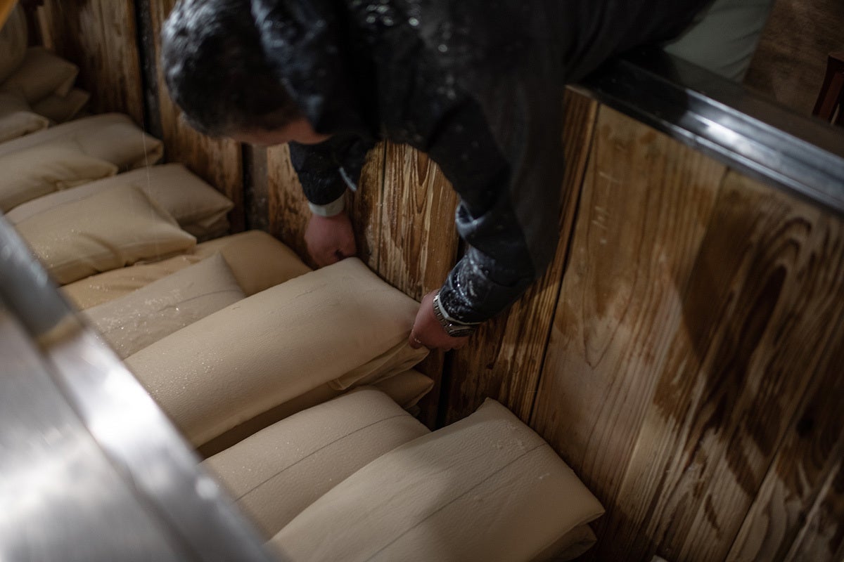 例えば絞りの工程では「佐瀬式」の槽を使い、二日間かけてゆっくり丁寧に絞ります。これにより醪(もろみ)中の旨味成分のみ抽出し、苦味、辛味成分を酒粕に残すことができます。酒粕を完全に絞り切りませんので、製成される清酒の量は減りますが、その分美味しいお酒ができるわけです。