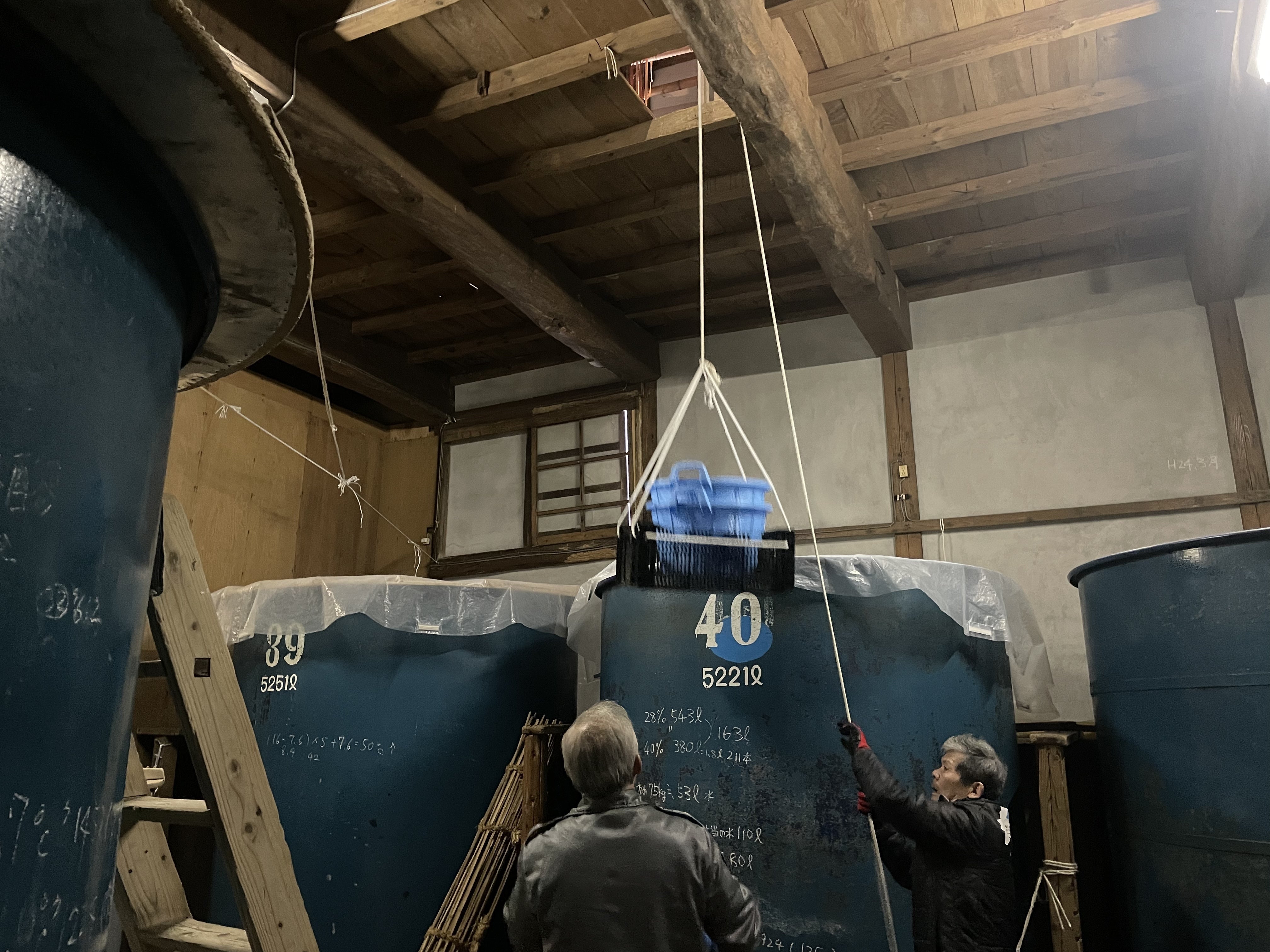 2023/01/18 21:43これから、二階にある麹室(むろ)から麹を下ろします。滑車とロープとコンテナだけで、簡単にエレベーターが出来ました。もっと早く作れば良かった。 もっと見る