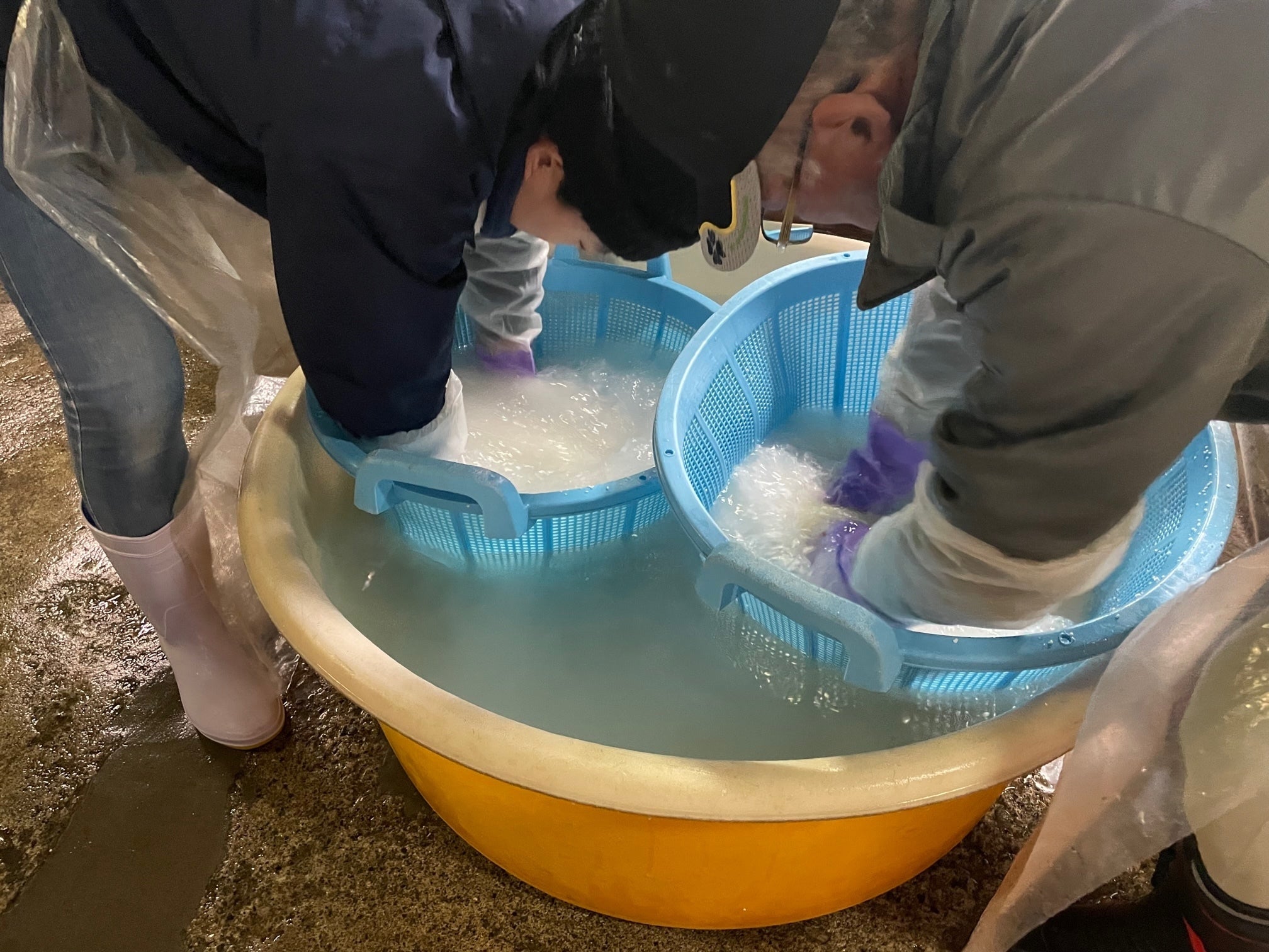 ザル一つに白米10kg入れて、手でとぎます。