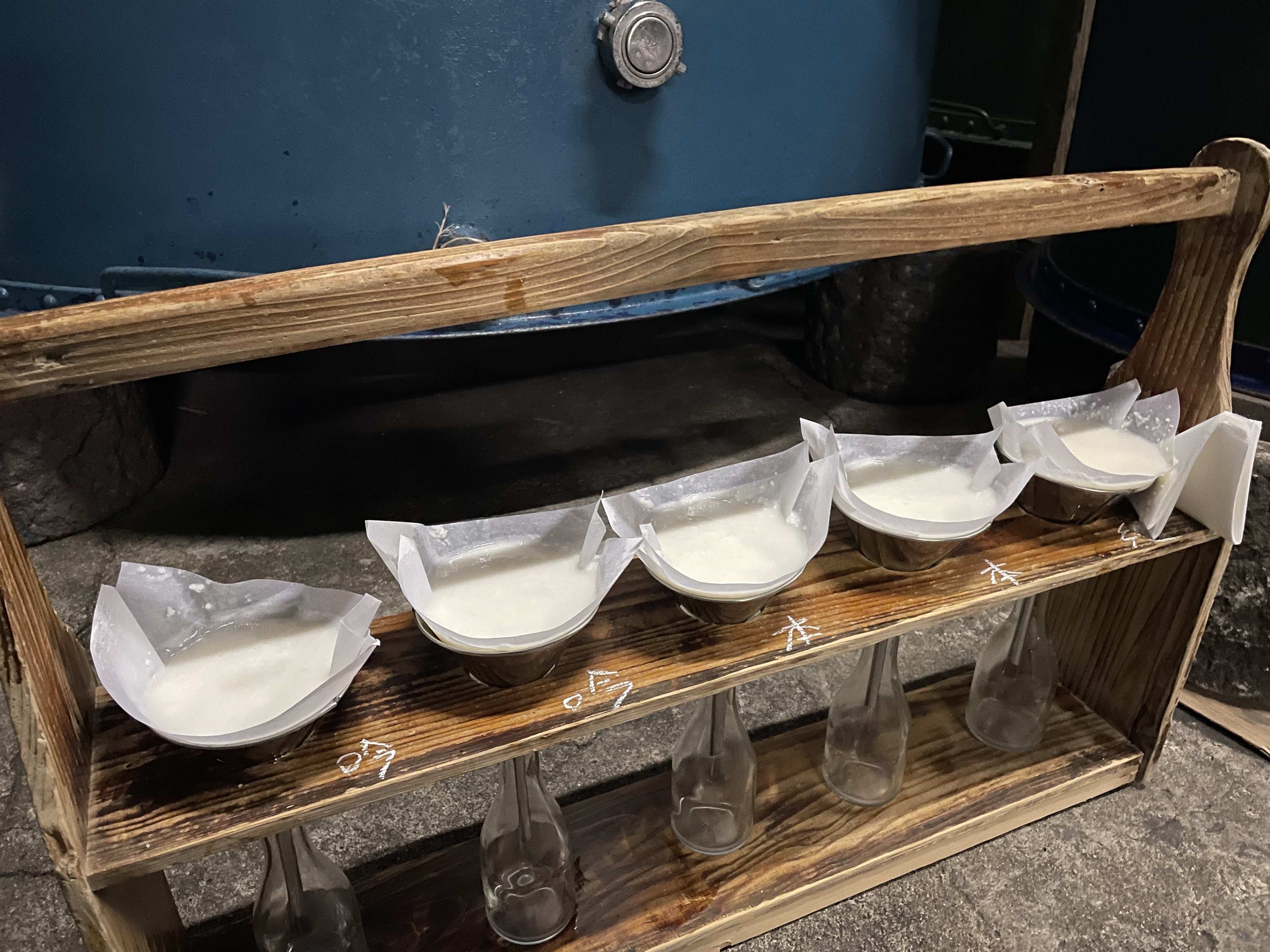 アルコール度、酸度、日本酒度を毎日チェックする為、少量の醪から濾液を取っているところです。