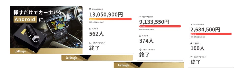 初代CarDongleは、リーズナブルな価格でカーナビAndroid化ガジェットとして人気を得て、CAMPFIRE だけで延べ1000名以上の方にご支援をいただいており、今もなお、公式サイトと楽天市場にて販売しています。