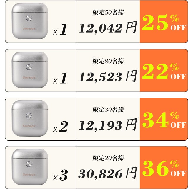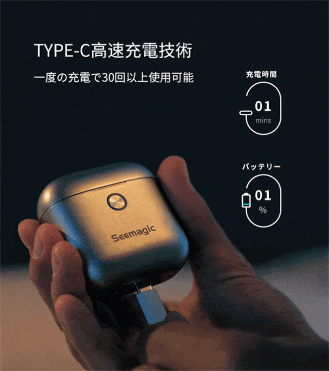 Seemagicは先進的なType-C高速充電技術を採用しており、1時間で80%のバッテリーを充電可能!600mAhの大容量バッテリーを内蔵しているため、一度の充電で30回以上使用できます。