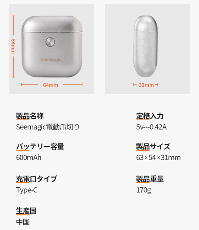 Seemagic(シーマジック)電動爪切りはボタン一つで操作でき、素早くカットできるだけでなく、爪研ぎも同時に行うことができます。指の爪の形に適したアーチ型設計により、簡単に滑らかな断面を実現!爪切りをより便利に、簡単に、安全に。