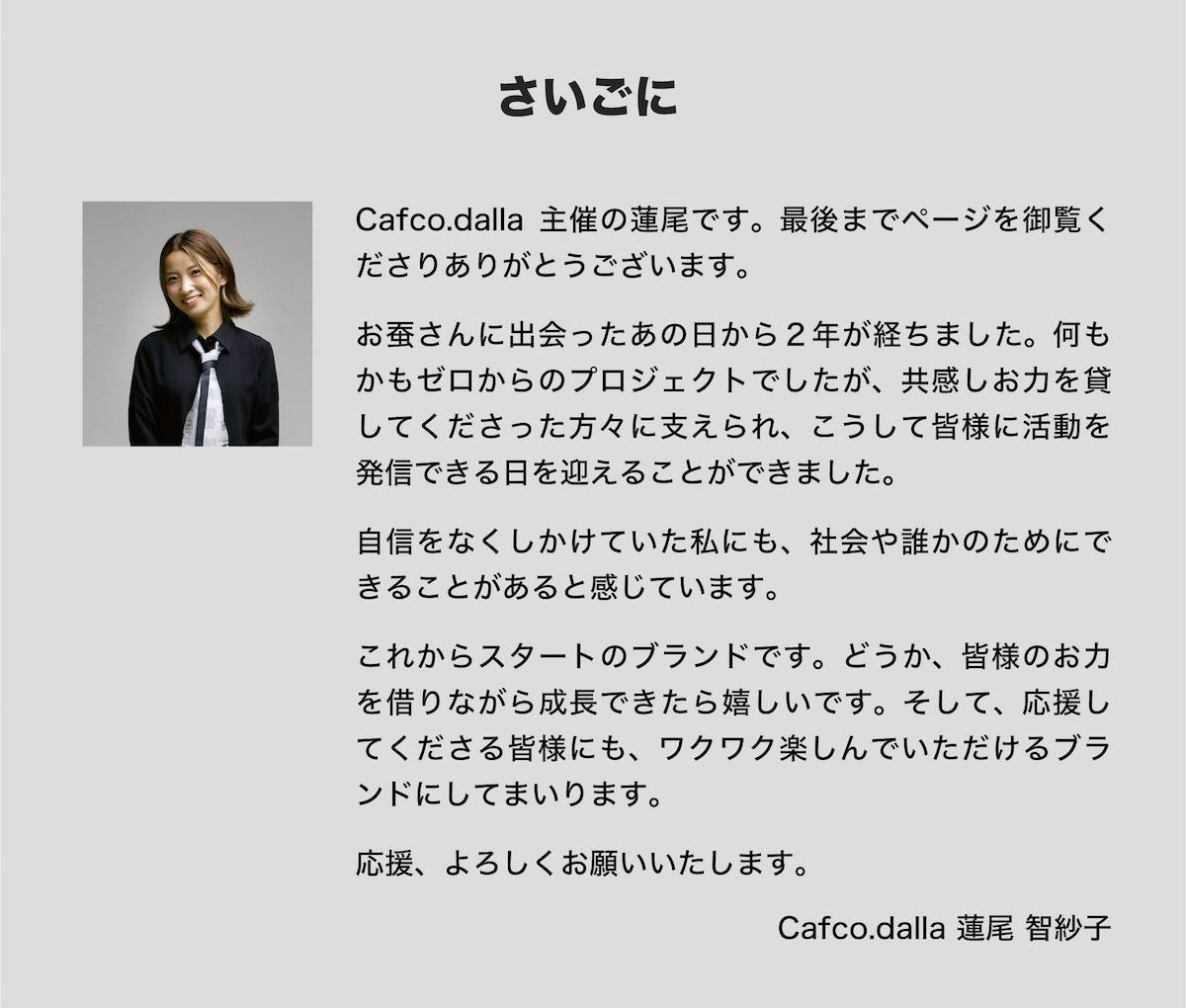 Cafco.dalllaは、命あるものの尊さ、養蚕からのものづくりなど「生きた物語のあるもの」を作り伝えることで、消費者のみなさんとともに社会課題と向き合っていけるブランドでありたいと思います。