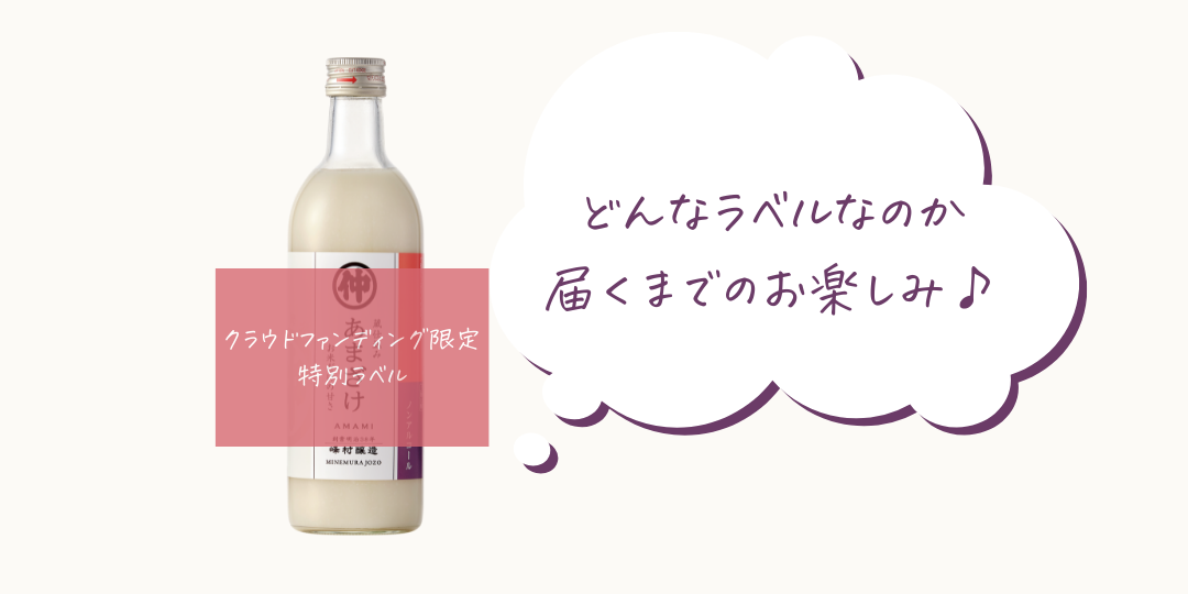 あまざけが苦手な人でも「飲みやすい!」と好評の峰村のあまざけ。味噌用の糀と日本酒用の糀を合わせて作ることで、旨みを感じつつスッキリとした味わいに仕上がっています。クラウドファンディングでしか手に入らない特別ラベルでお届けします!