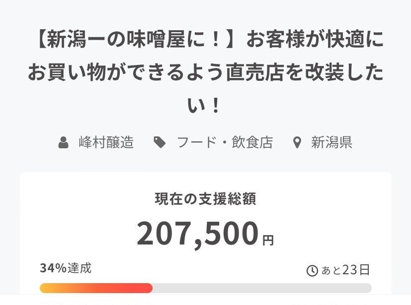 こんにちは、峰村醸造の曽我です。プロジェクト開始から1週間が経ち、支援金額が目標金額の3分の1まで到達しました!ご支援いただいたみなさまありがとうございます!!今後ともプロジェクトをお見守りいただきたいのと同時にぜひ周りの皆さまへもご周知いただけますと幸いです。_____________________現在、峰村醸造 直売店はというと年末の繁忙期を迎えております。お歳暮やお年始、帰省用の手土産ギフトなどご来店がとても増えているところです。今日はお客様から「よいお年を」とお声がけいただき、年の瀬を感じるとともに、お客様の心遣いに心温まりました。2023年はお客様に恩返しができる1年になるよう、まずは残りわずかな2022年、1日1日を大切にしていきたいと改めて思いました。引き続き本プロジェクトの応援をよろしくお願いいたします!峰村醸造 曽我