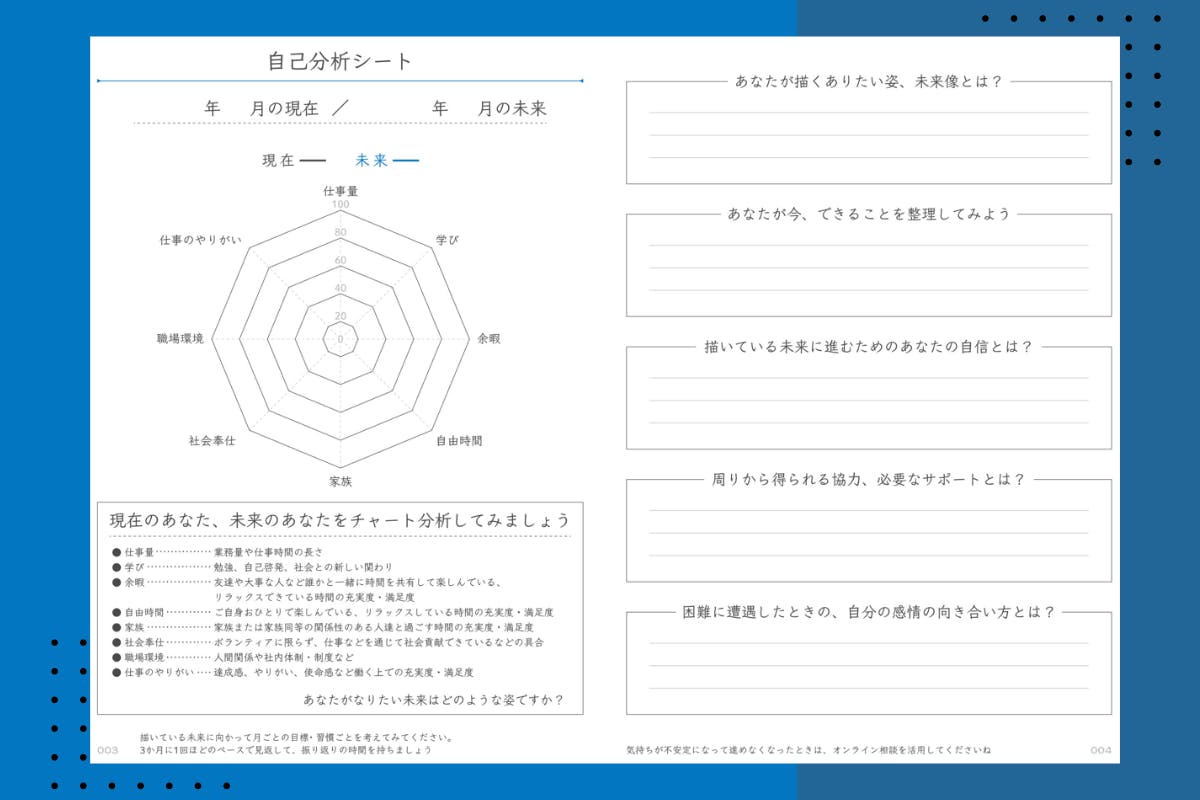 手帳を使い始める前に、自己分析ワークで現在地点を確認することができます。仕事のことだけでなくプライベートも含めた現在のあなたの状態を数値に落とし込み、可視化します。理想とする未来を描くことで、その未来を実現するために必要な目標や習慣が見えてきます。