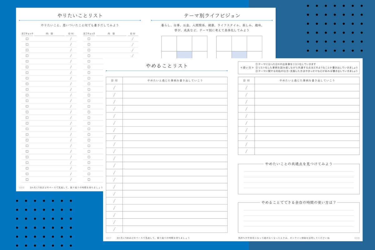 やりたいこと、やめることなどを書き出すことで、実現したい未来のために、何を足して何を引くべきなのかを考えます。リスト化することで自分の思考のクセや傾向に気付くことができます。