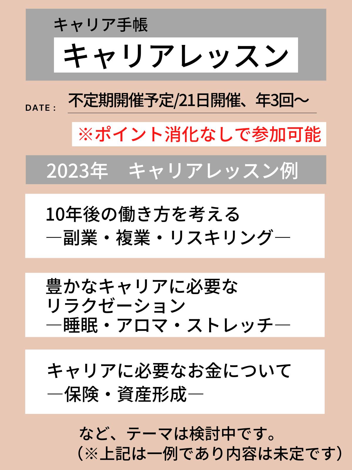 2023年のキャリアレッスンでは、保険、睡眠、アロマ、占い、複業、姿勢ストレッチ、婚活支援、資産形成、セルフケアなど、多彩なジャンルの専門家とコラボして開催する予定です。(※不定期開催予定。21日開催、年3回~となります)