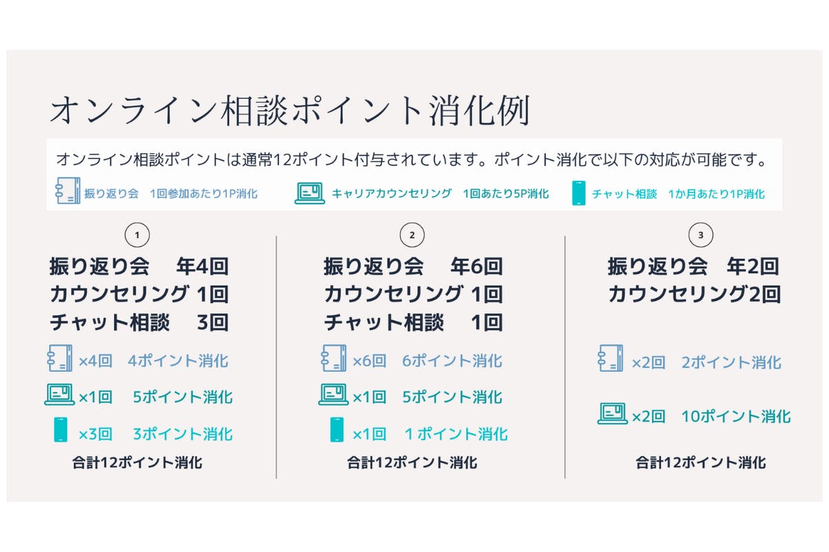 手帳にはオンライン相談ポイントが付与されますので(※通常12ポイント+クラウドファンディングだけの特別追加2ポイント=14ポイント)、1年間を通じてポイント消化してご利用いただけます。スマホやタブレット、パソコンから、お好きなタイミングでご相談下さい。