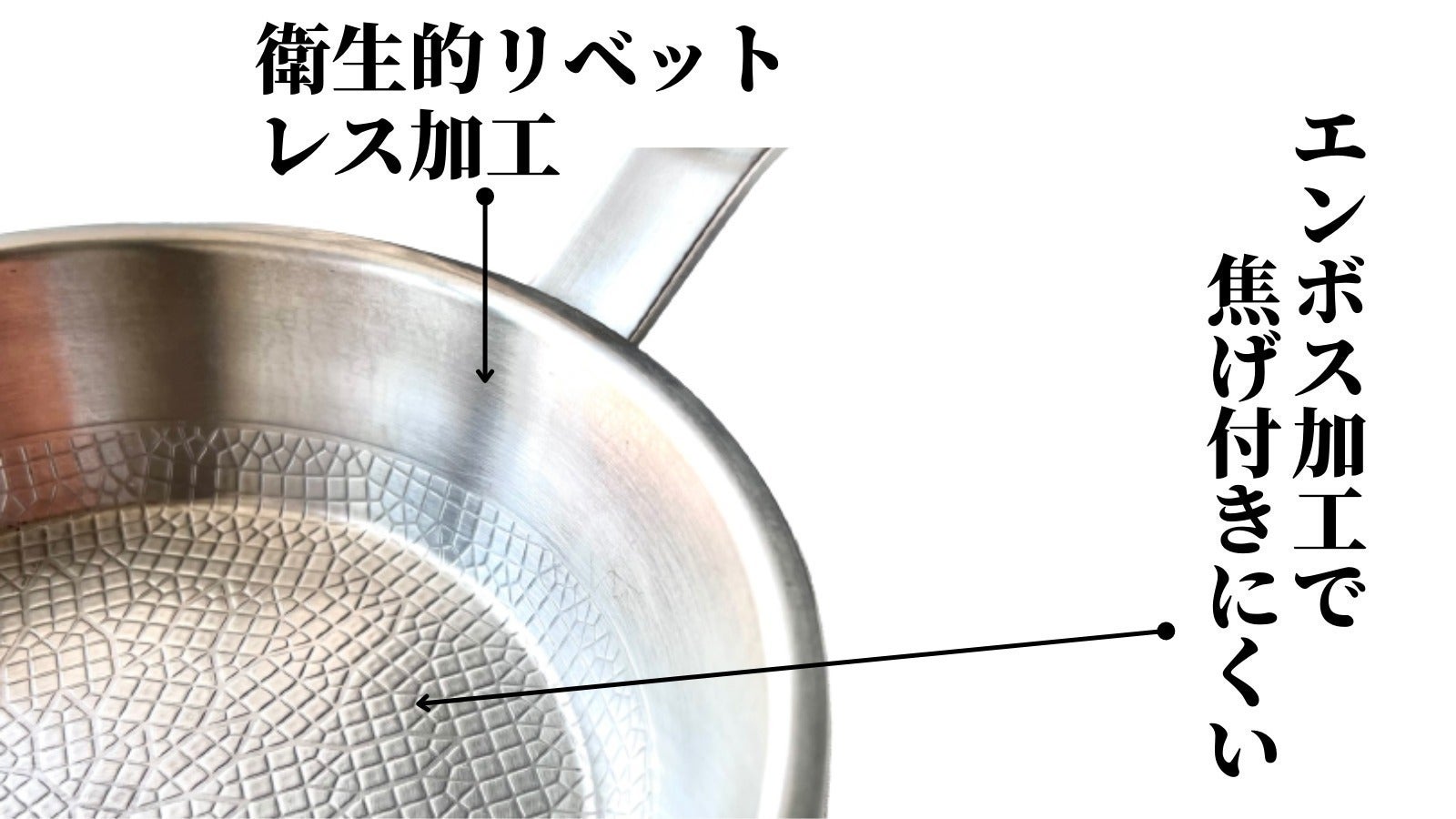 調理面がリベット(持ち手を固定する丸い突起)接合ではなくツルンとして調理性に優れ衛生的