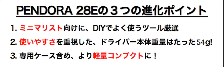 PENDORA 28Eは、よりコンパクトでより多機能な商品を届けたいという思いで開発しました。全て箱の中に収納ができ、軽いのでカバンに入れて持ち歩いてもあまり重さを感じないように設計しております。ぜひ、お手に取って作業の快適さを体感してください。