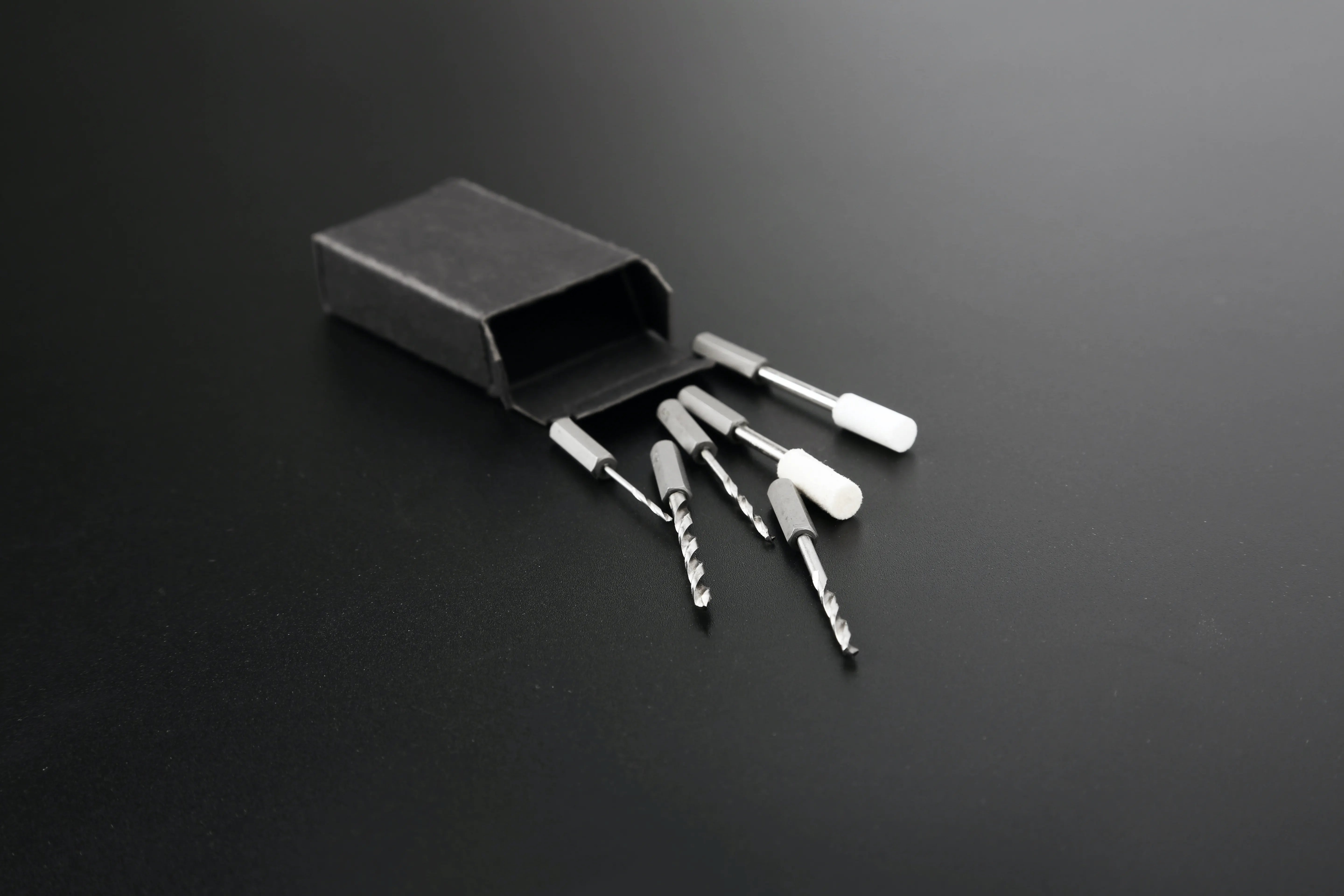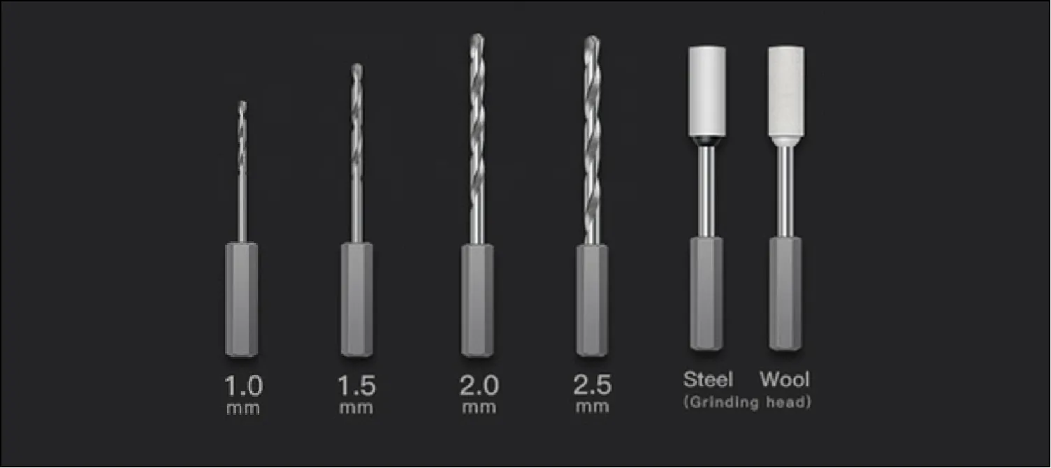 前モデルで大好評24種のビットに加え、今回は穴あけと磨き加工が可能になる4本のドリルと2本のポリッシャーをセットに追加しました!