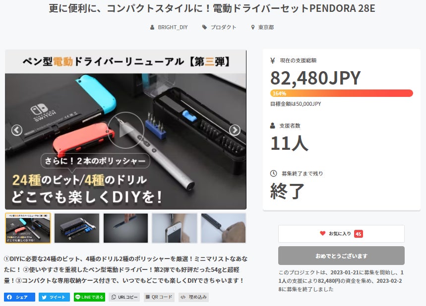 皆様にご満足いただけるリターンをお届けできるよう、全力で取り組んで参りますので引き続き、更に便利に、コンパクトスタイルに!電動ドライバーセットPENDORA 28Eをよろしくお願い致します。