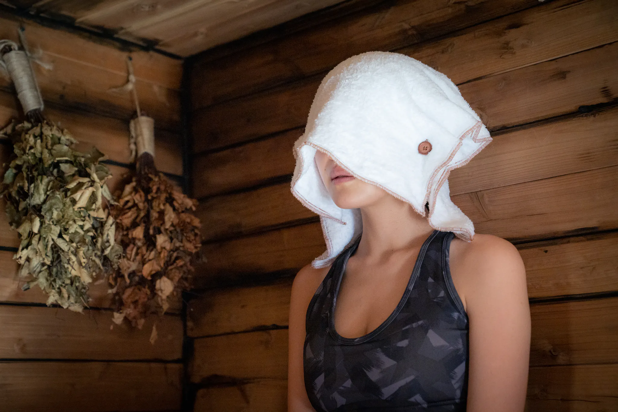 ボタンを留める事で頭からかぶる事ができ、サウナの熱から頭皮や髪の毛を保護するのですが、
