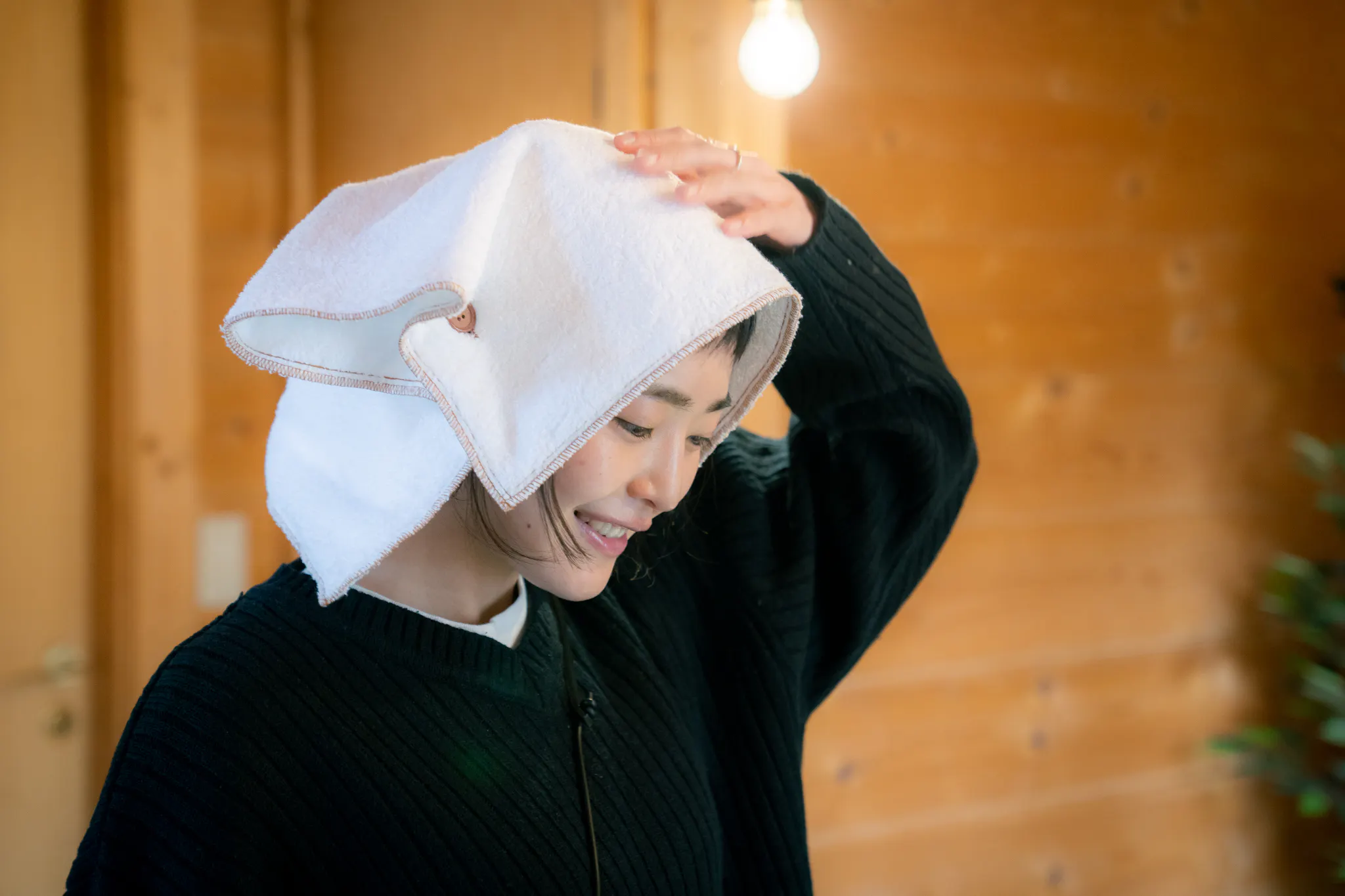 「サウナハットを持ち歩かなくても、とりあえずこのタオルがあれば全部オッケー!」っていう便利なやつです!