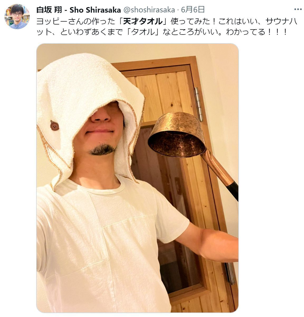 「サウナハットを持ち歩かなくても、とりあえずこのタオルがあれば全部オッケー!」っていう便利なやつです!