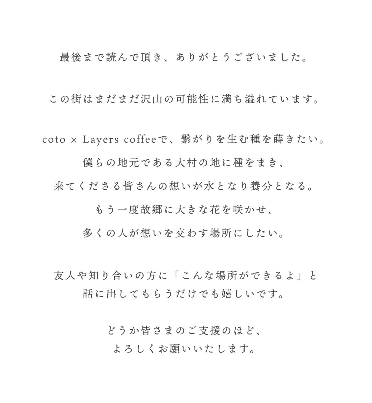 私たちがクラウドファンディングを行う目的は、大村はもちろん、長崎県内そして全国の仲間と繋がり、coto × Layers coffeeの新たなチャレンジを知ってもらい、応援していただくためです。