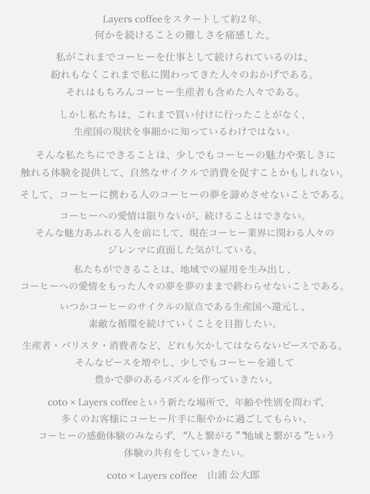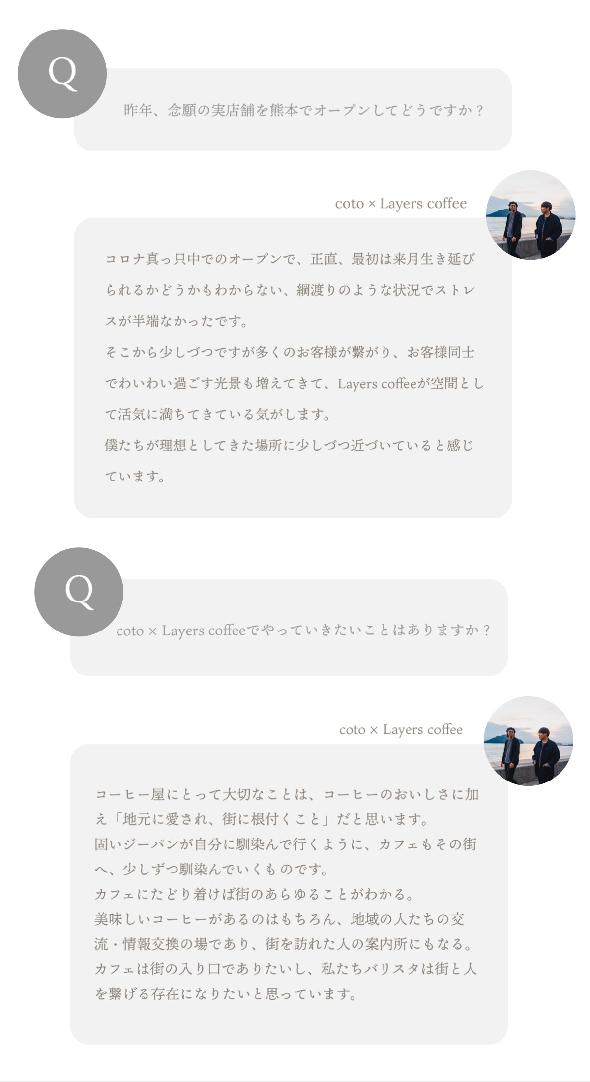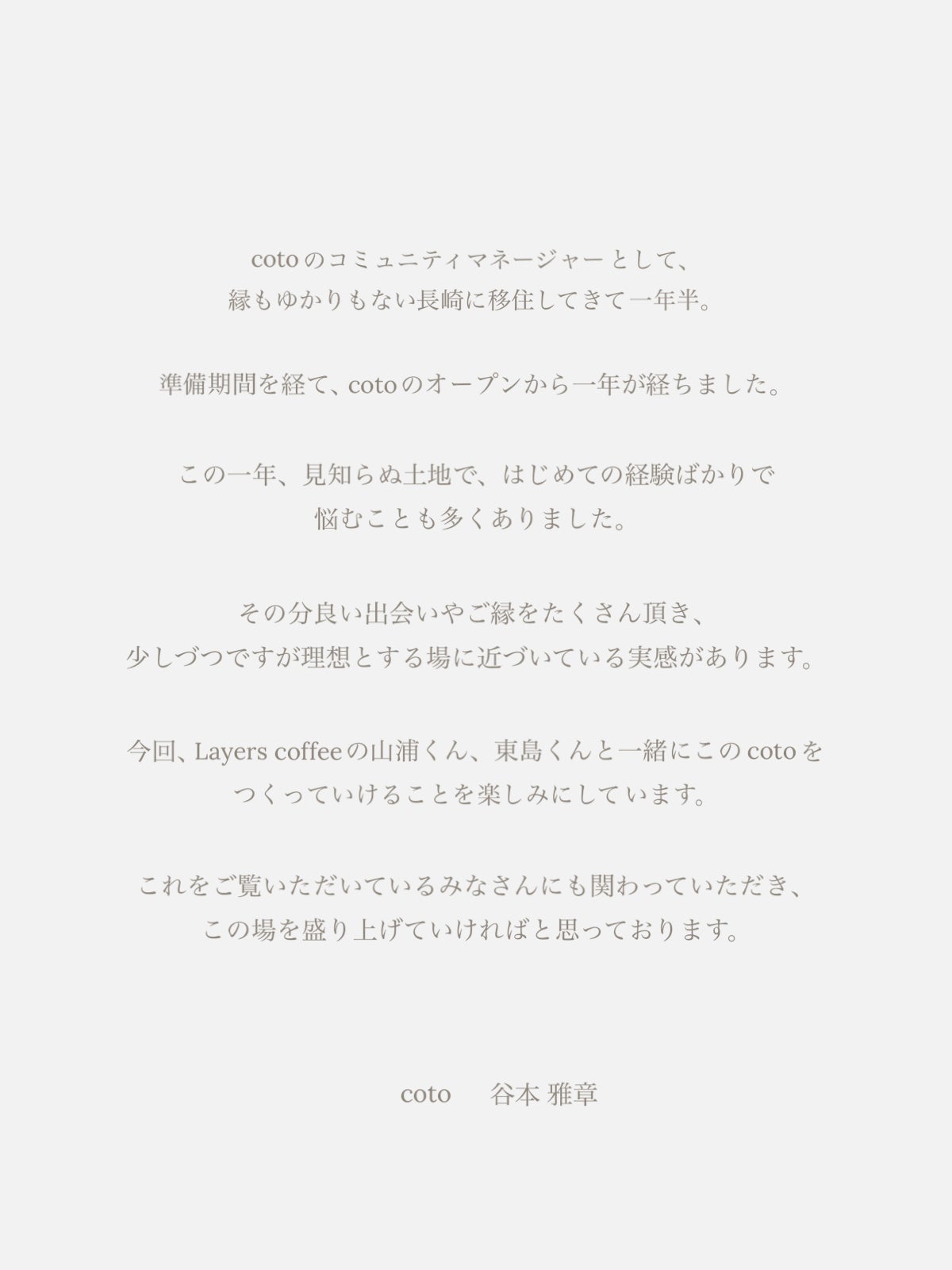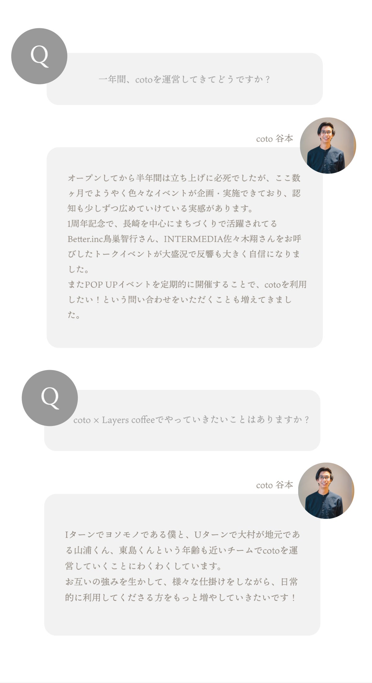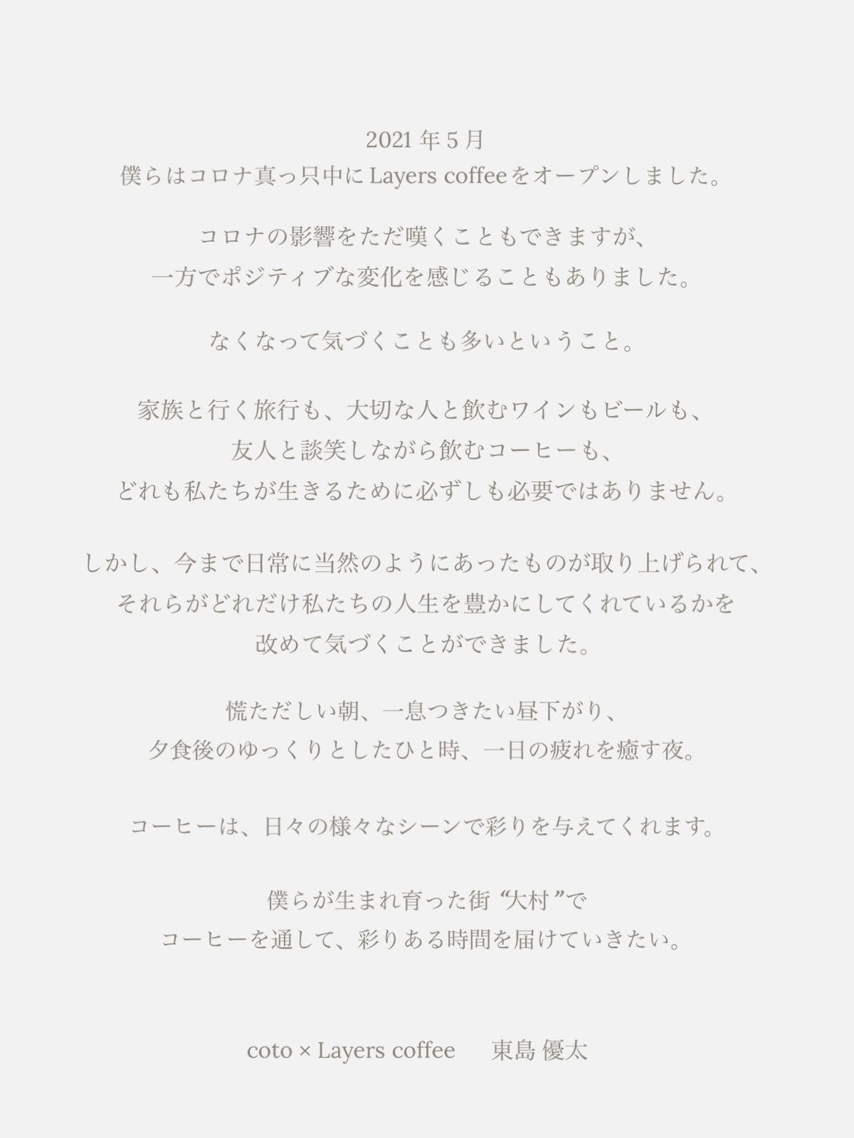大村市で生まれ育った山浦と東島が立ち上げたコーヒーショップ "Layers coffee"と、大村市で新たな出会いや発見をつなぐHUBとしての役割を担う場 "coto"が出会い、あらたな場づくりをスタートします。
