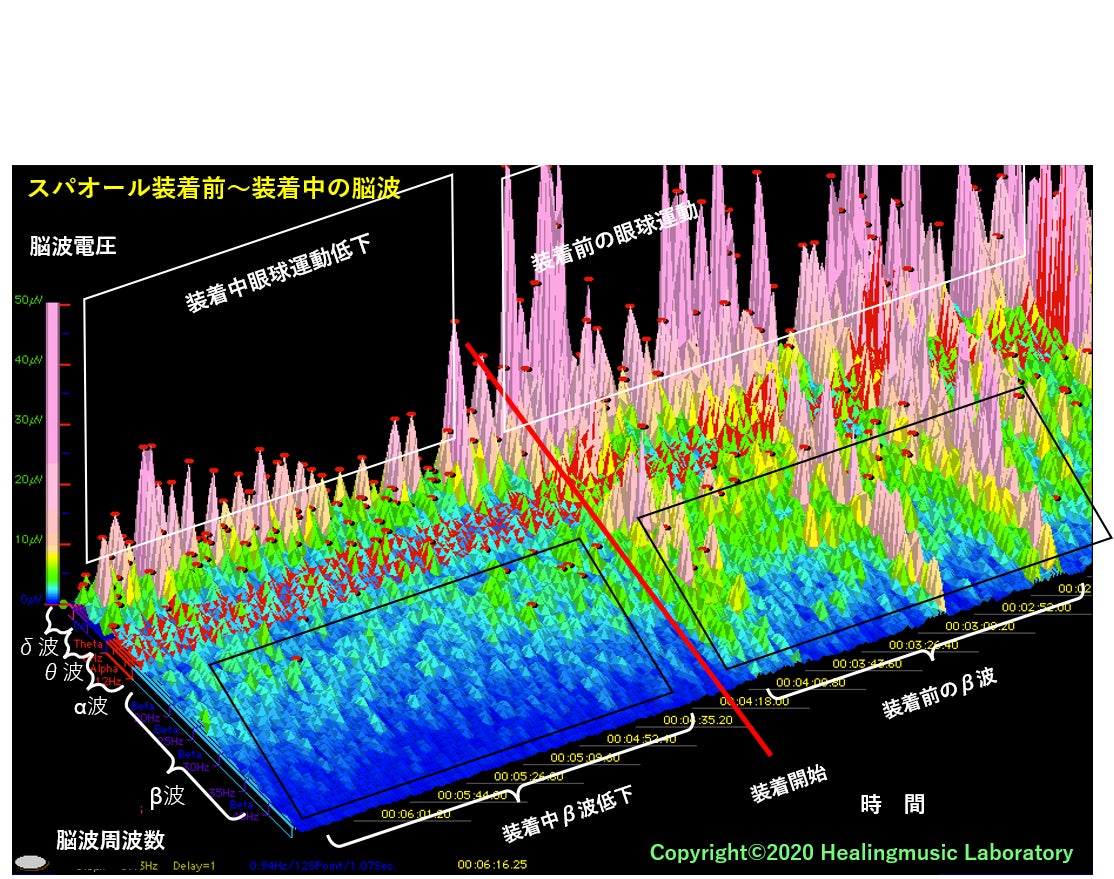 スパオールを装着した直後から、β波と眼球振動が低下してリラックス傾向に遷移しています。