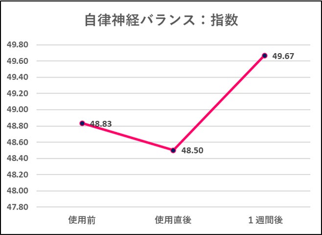 こちらは自律神経バランス。通常生活時は50%が理想とされていて、スパオール製品を使用しつづけることでバランスの乱れが3分の1程度に減少することが示されています。