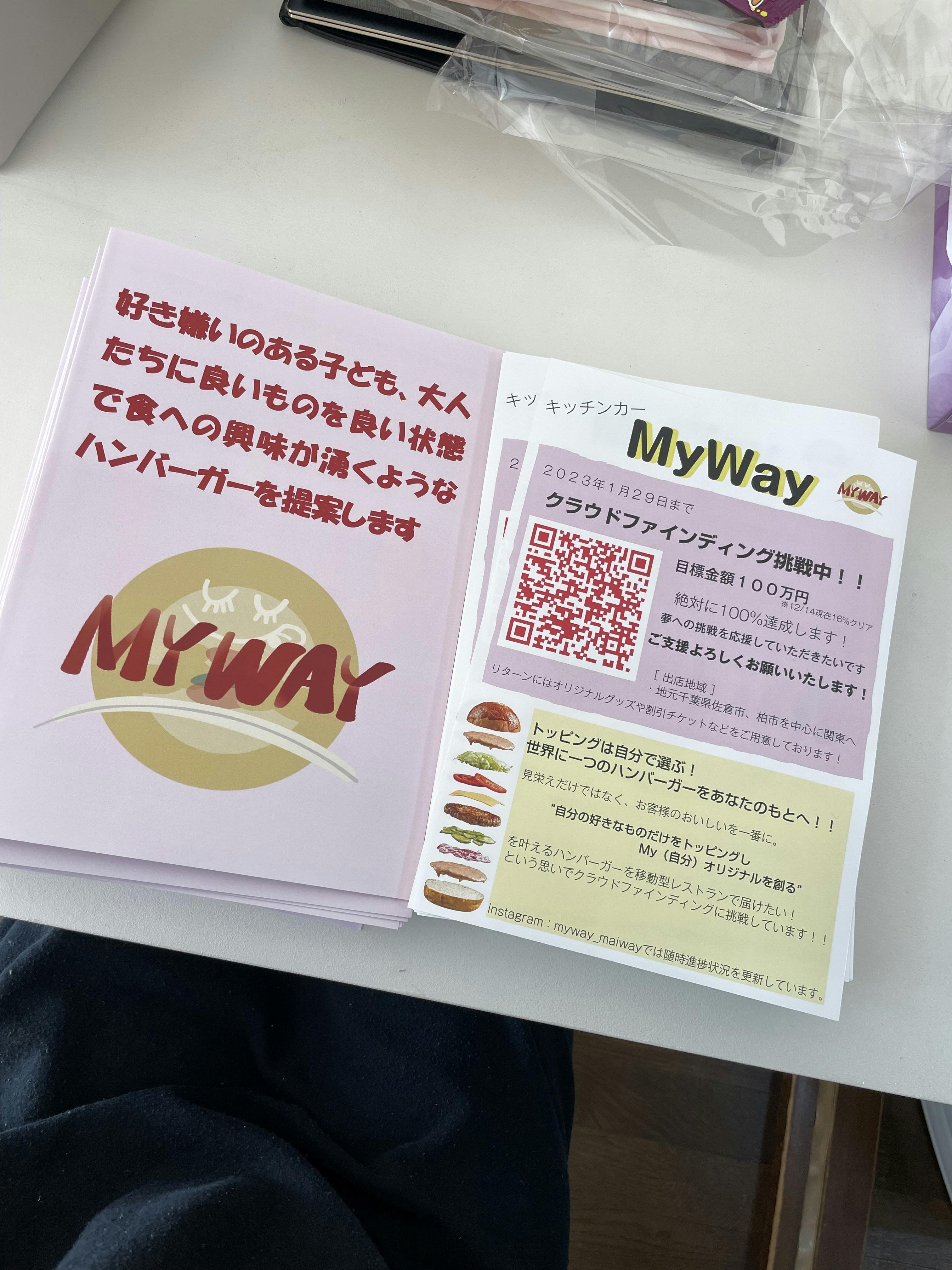 2022/12/18 21:46こんばんは MYWAY マネージャー 悠門です。キャンプファイヤーを開始し2週間が経過しました。はじめは支援者はほとんど集まらないのではないかと不安でしたが目標金額17%を集うことができました。支援者してくださった皆様。本当にありがとうございます。支援者様にきちんと答えられるよう100%達成頑張ります。ですがやはり個人事業ではありますのでなかなか拡散力がないことが課題ではあります。また、周りの方々に相談したりアドバイスのご教授をいただきましたが、厳しい意見をたくさんいただきました。そこで、MYWAYは自分たちの思いが伝わりにくい形であったこと、自分たちのハンバーガーが消費者様にどんなベネフィットがあるのかうまく伝えられていなかったことに気づくことができました。夫婦で考え出した答えが、自分たちの思いを形にしようと思い、パンフレットを作成することでした。柏市、流山市近辺のお店にお願いし、作成したパンフレットを掲示、配布していただくことになりました。これからも我々の活動を見守っていただけると幸いです。また我々の活動をこれからもご支援よろしくお願いします。 もっと見る