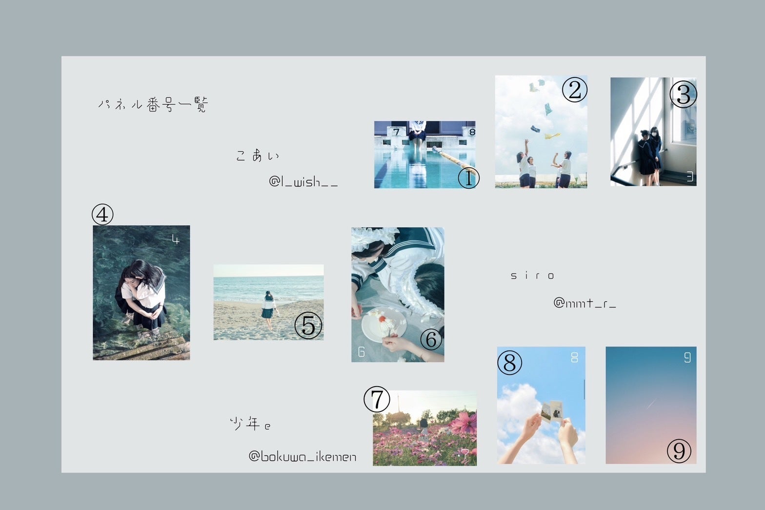 私はSNS上で高校生写真家として写真を載せ始め、現在は私自身の年代の青さ、未熟さ、そしてそのように青く未熟ながらも自分の生きる道を模索し日々を過ごす少年少女たちを写しております。