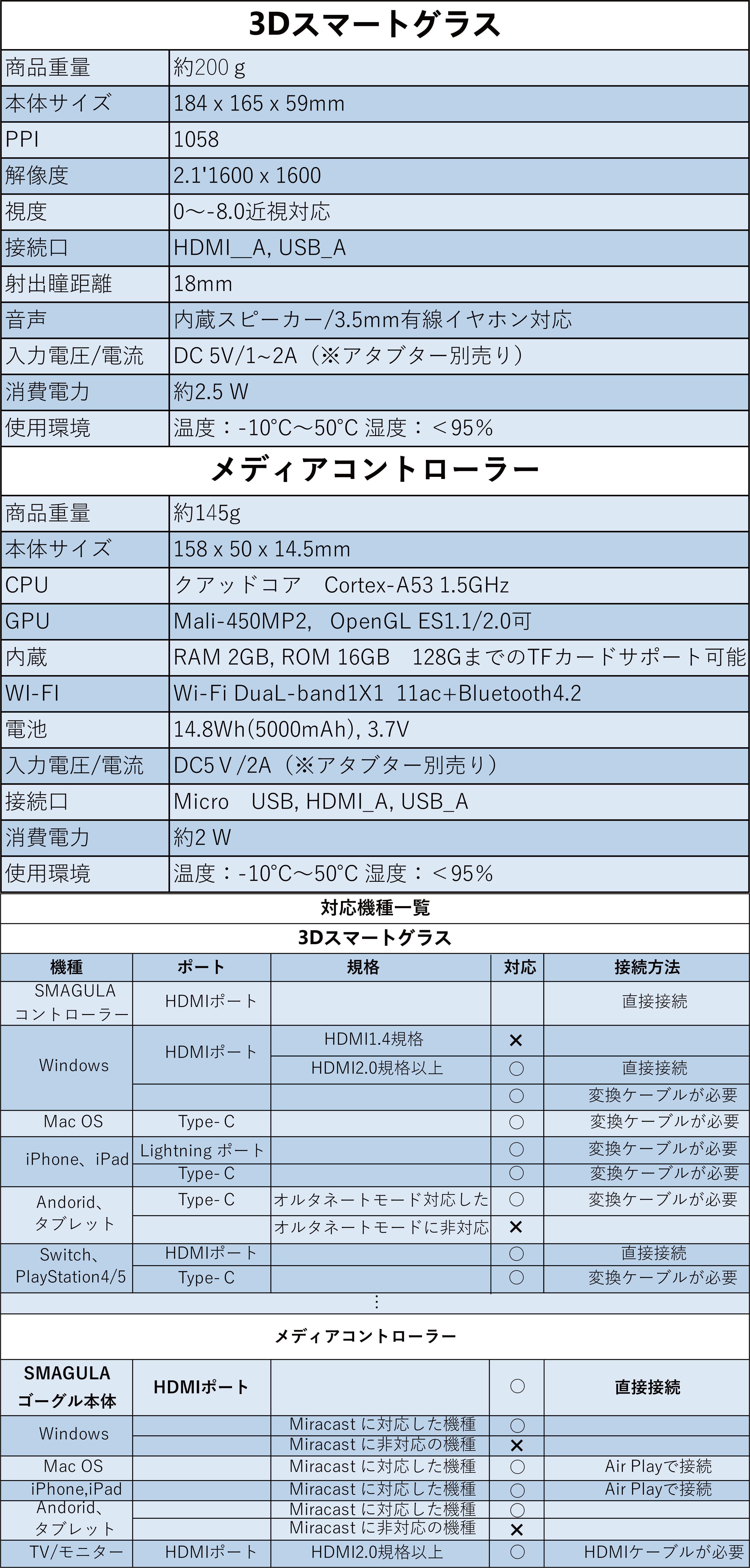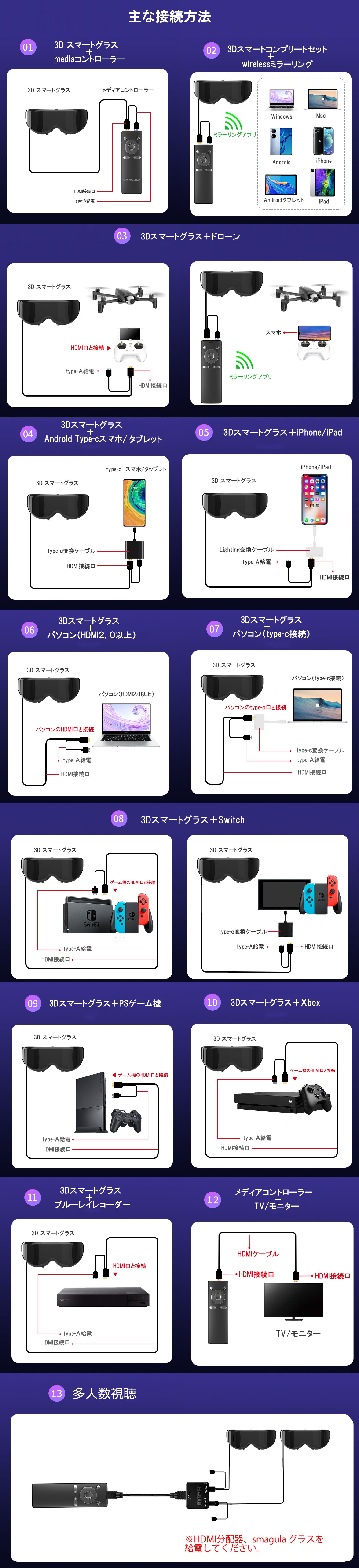 A:3Dグラスの場合デバイスのOSは問わず、HDMI出力対応なデバイスに対応しています。(Android、iOS、Switchなどの場合変換ケーブルが必要、純正品をお勧めします。)コントローラーの場合デバイスOS問わず、ミラーリング送信可能なデバイスに無線対し、HDMI出力可能なTVやモニターをHDMIケーブルで接続できます。