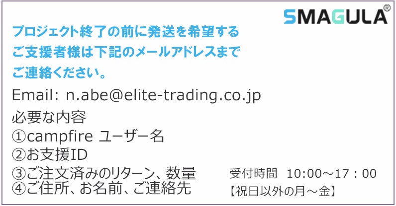 2023/03/06 16:28ご支援皆様へお世話になっております。エリート貿易です。いつも変わらぬサポート・支援を頂きまして心より感謝申し上げます。この度は「SMAGULA」をご支援いただき、誠にありがとうございます。本日全ての発送は完了致しましたのでご報告させて頂きます。「SMAGILA]が皆様の生活のお役に立てることを願っております。この度は弊社プロジェクトにご支援いただき、誠にありがとうございました。今後とも変わらぬご愛顧を賜りますようお願い申し上げます もっと見るプロジェクト終了致しました!