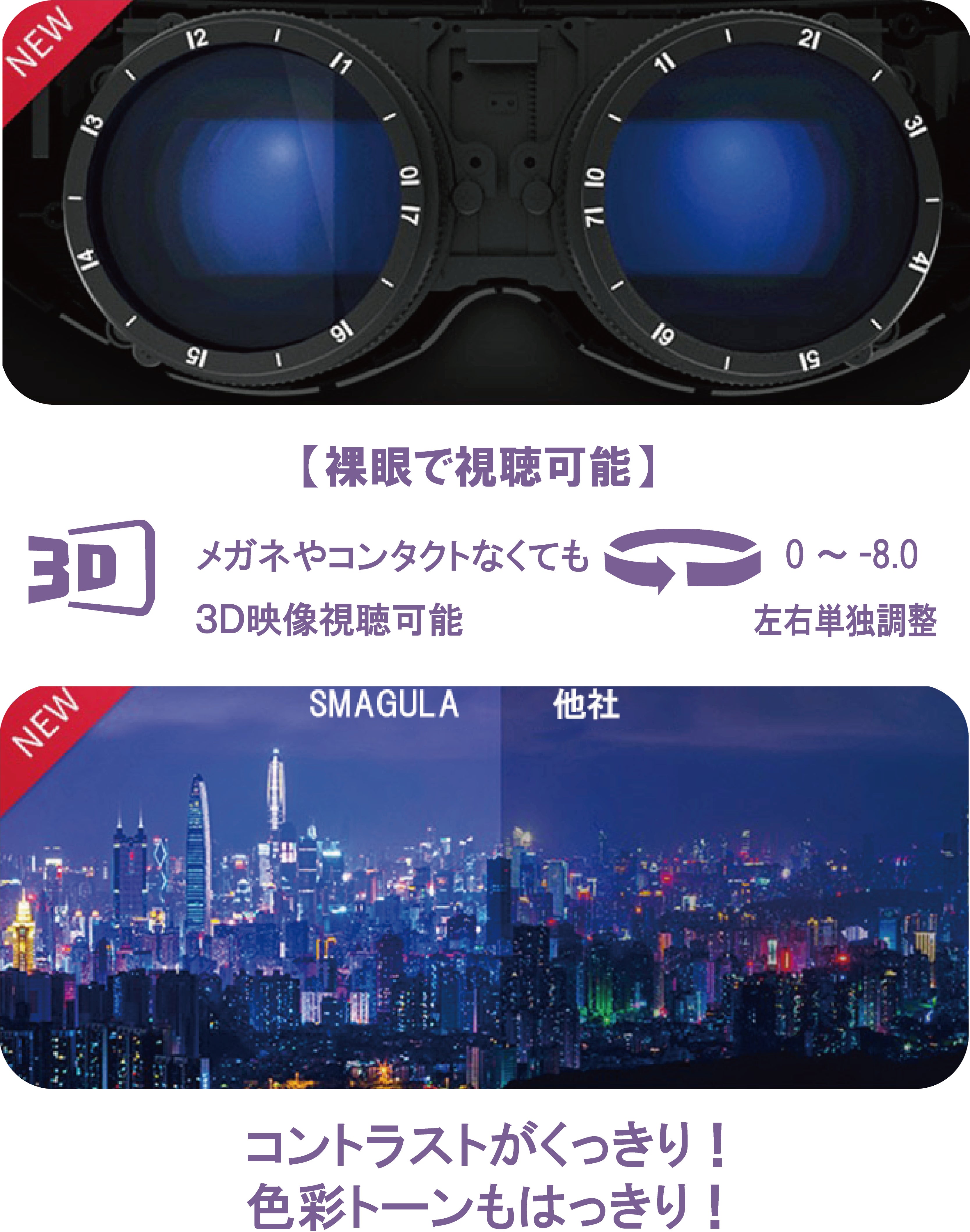 SMAGULA 3Dスマートグラスは視度調整機能付き、0~-8.0の近視の方でもメガネやコンタクトが なくてもピント調整しクリアな映像を裸眼でお楽しみいただけます。