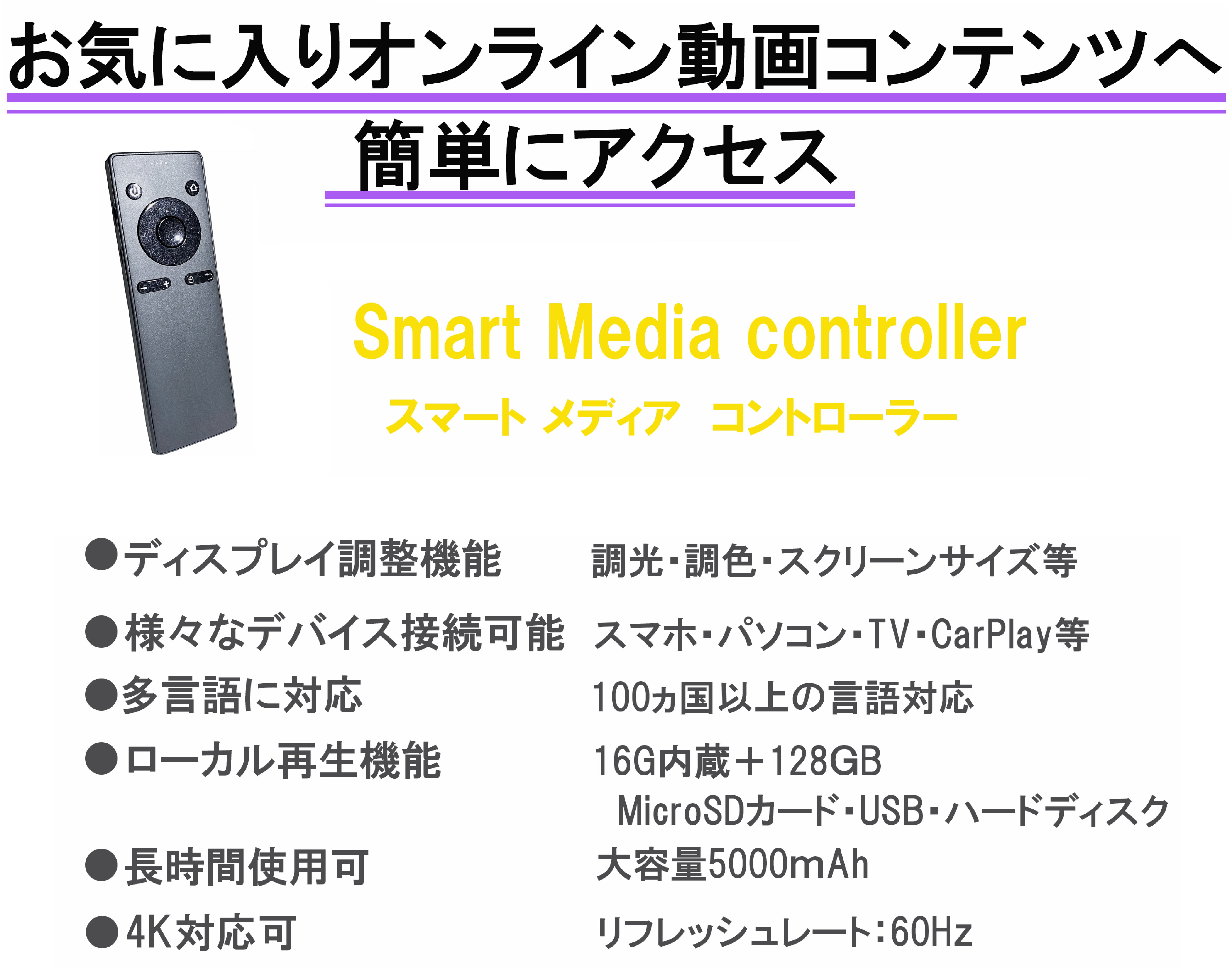 また、メディアコントローラーにお好きな動画を保存しておけば、屋外、飛行機や新幹線など移動中でもいつでもどこでも観ることができます。