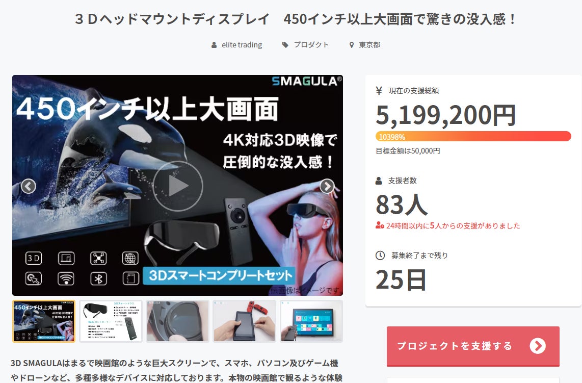 ご支援者の皆様こんにちは!エリート貿易です!本日、プロジェクトが無事終了致しました!本当に多くの皆さまにご支援いただき、誠にありがとうございました!社員一同、心より感謝しております!これからも、『SMAGULA』をどうぞよろしくお願い致します!発送に関しての進捗状況お知らせ等はこちらの活動報告より更新させていただきます。何卒よろしくお願い申し上げます。