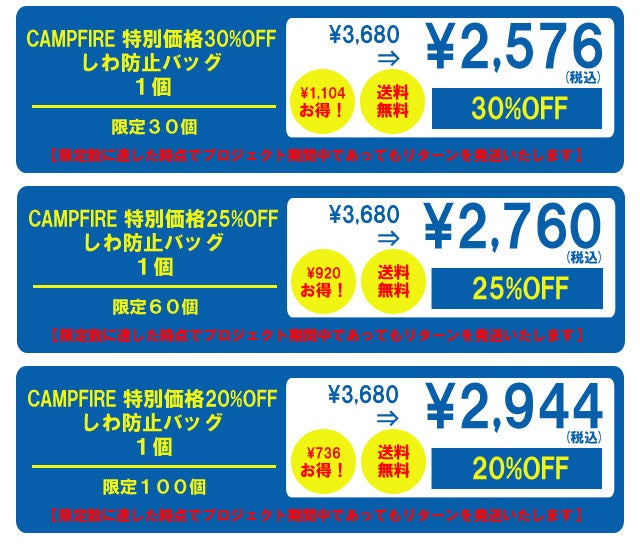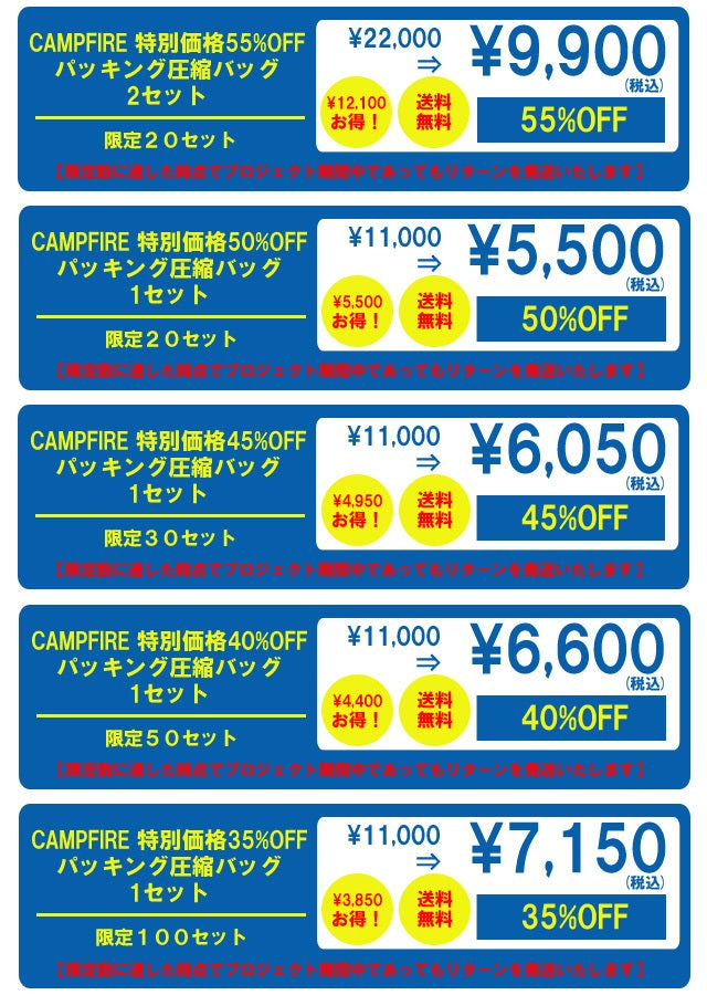 2023/12/05 16:49これまでCAMPFIREで開催したプロジェクトに、ご関心をお寄せいただきましてありがとうございます。現在はバラエティーにとんだ、生活に役立つアイテムでプロジェクトを開催しております。自宅でもオフィスでもキャンプでも!!使いたいときにすぐに使えるアンブレラ式ベッドhttps://camp-fire.jp/projects/view/722078現在はほかに複数のプロジェクトが進行しております。冬の寒さの温暖革命!!最新テクノロジーのペルチェ式でぽかぽか快適ネックウォーマーhttps://camp-fire.jp/projects/view/689613寒い冬でも究極の温かさを革命的新素材エアロゲルで実現!!快適な睡眠のための掛布団https://camp-fire.jp/projects/view/647135外国人との言葉の不安を瞬時に解消!!134か国語の翻訳や画像翻訳もできる翻訳機 LanFreehttps://greenfunding.jp/lab/projects/7673びっくり!!水がのぼって見える??摩訶不思議でとてもおしゃれなインテリア加湿器https://camp-fire.jp/projects/view/712762お風呂後も優しく乾せて、快適でストレスもない360度全方位の幸せドライヤーハウスhttps://camp-fire.jp/projects/view/703909電動エアーポンプ・高圧洗浄機・ジャンプスターターにもなる5way超多機能マシーンhttps://camp-fire.jp/projects/view/684383 旅行の荷物を半分にしたり、2倍の収納をしたりすることができる圧縮パッキングバッグhttps://camp-fire.jp/projects/view/710825もしこれらのプロジェクトにつきましてもご関心をおもちいただけるようでしたら、ご支援を賜れれば幸いです。またもしできましたら、X(Twitter)・Facebook・Instagram・Youtube・Line等々SNSでこれらのプロジェクトをシェアいただけるようでしたら幸いです。是非とも皆様のお力をおかしいただきたく存じます。何卒よろしくお願い申し上げます。 株式会社フェリクス もっと見る限定数リターンの発送について