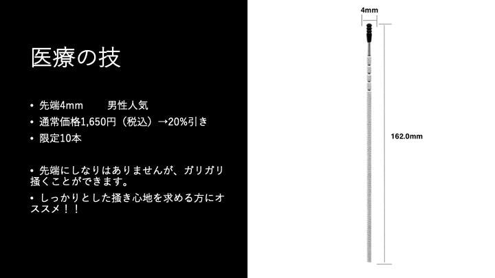 4mmはしっかり掻きたい方へ。先端にしなりはありませんが、ガリガリと掻くことができます。特に男性人気の一品です。