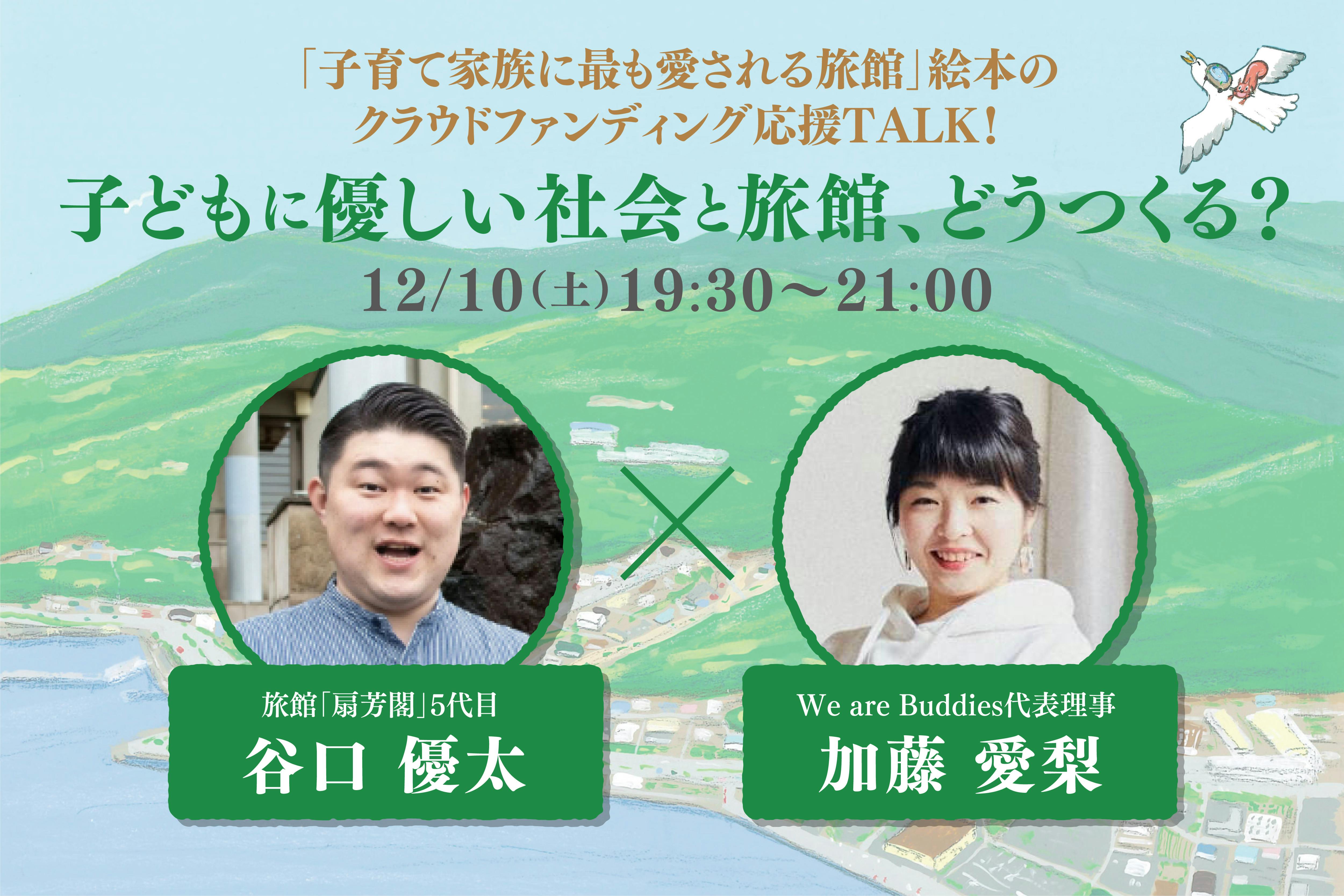 12月10日(土)19:30〜21:00には、オランダ発の「子どもと大人のバディプログラム」を日本で展開する(社)We are Buddies代表理事の加藤愛梨さんと、「子どもに優しい社会と旅館、どうつくる?」をテーマに、オンライントークを実施します!