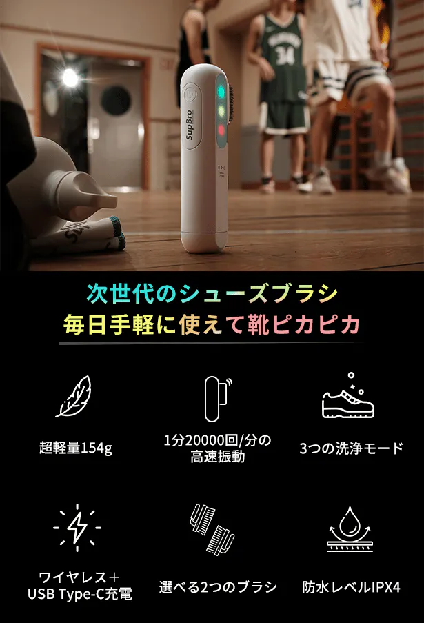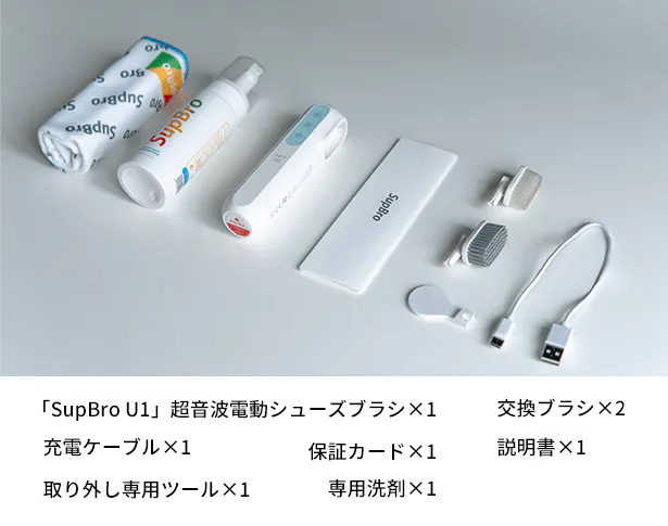 「SupBro U1(サップブロ)」超音波電動シューズブラシは、毎日手軽に使えるコンパクトな靴ケアグッズです。1分当たり20000回振動する超音波技術で、頑固な汚れもすばやく落とします。専用洗剤を併用すれば、水を使わなくても短時間でピカピカに。靴ケアの時短をお手伝いします!