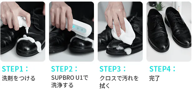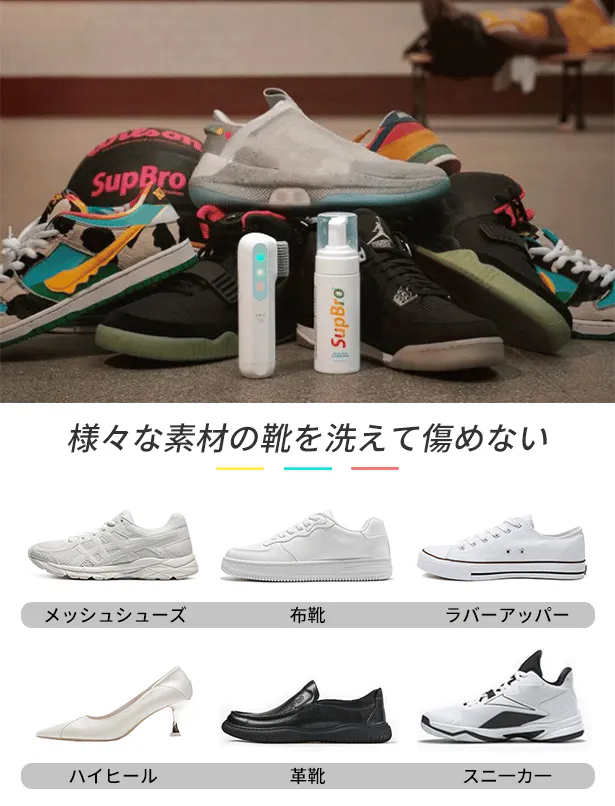 運動靴だけでなく、本革や合皮、帆布の靴まで、SupBro U1は素材を選ばず洗浄可能です。お手持ちの様々な靴を超音波振動ですっきりきれいに仕上げます。