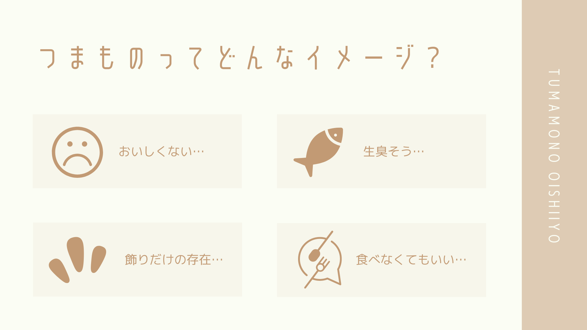 皆さんが「つまもの」に抱いているマイナスなイメージを払拭して、つまもの美味しく食べてもらいたい!
