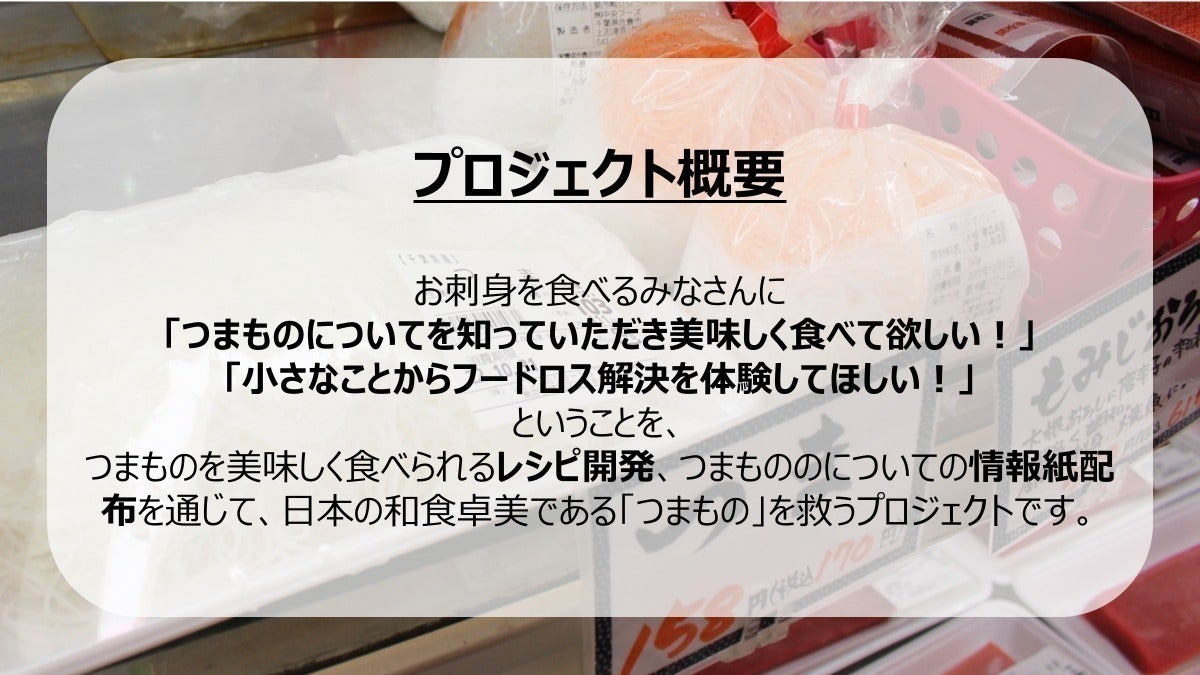 プロジェクト①:料理研究家の方の協力のもと、「つまもの」を美味しく食べられるレシピを開発します!魚市場、デパート、商店街をはじめとする生鮮食料品店を中心に、開発したレシピ及びつまものの情報紙を配布いたします。