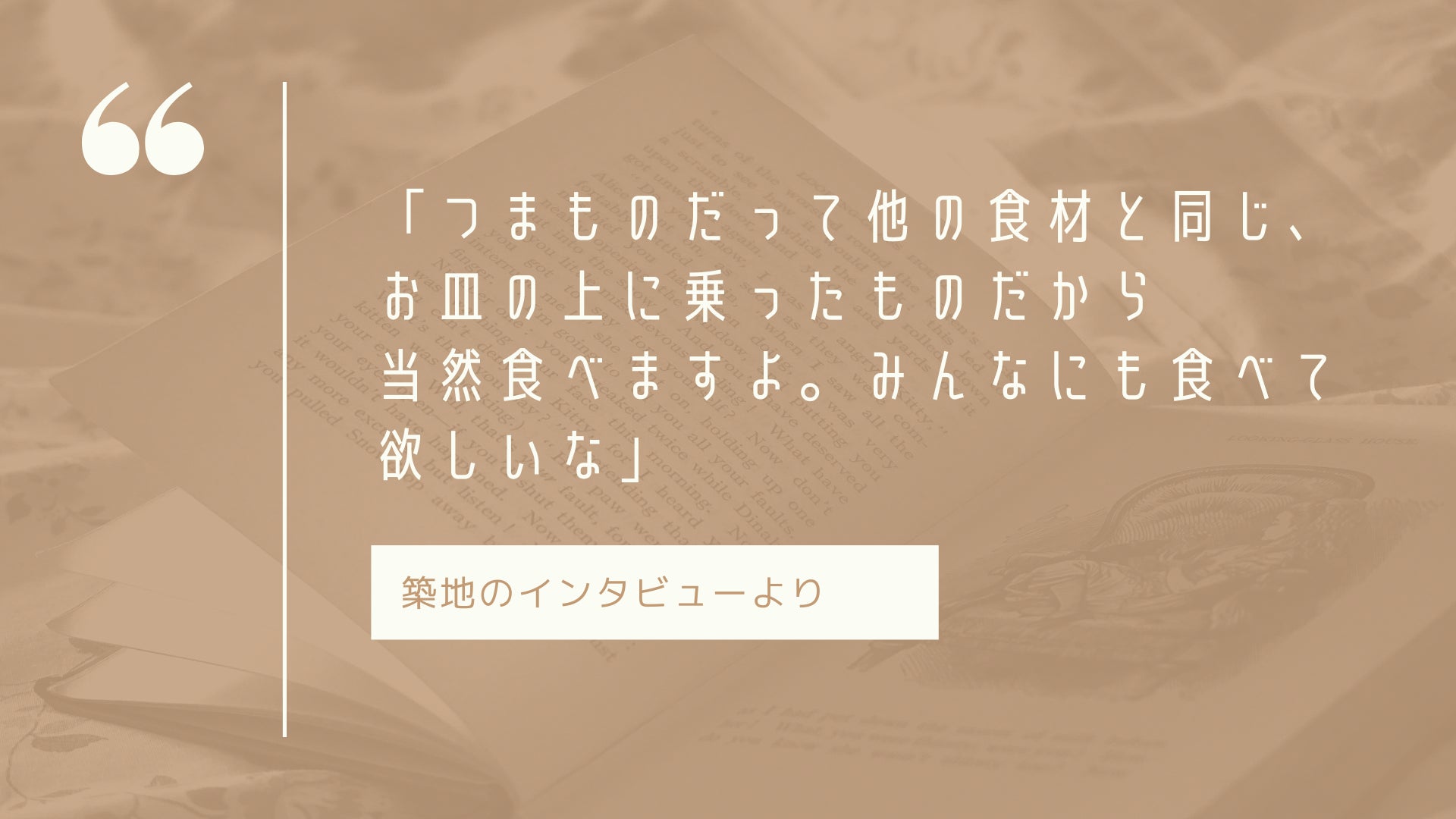 その中で、山本が和食の総本山である京都に住んでいること、魚市場に縁があったことから、和食やお刺身の横に添えられている「つまもの」の存在を思いつきました。